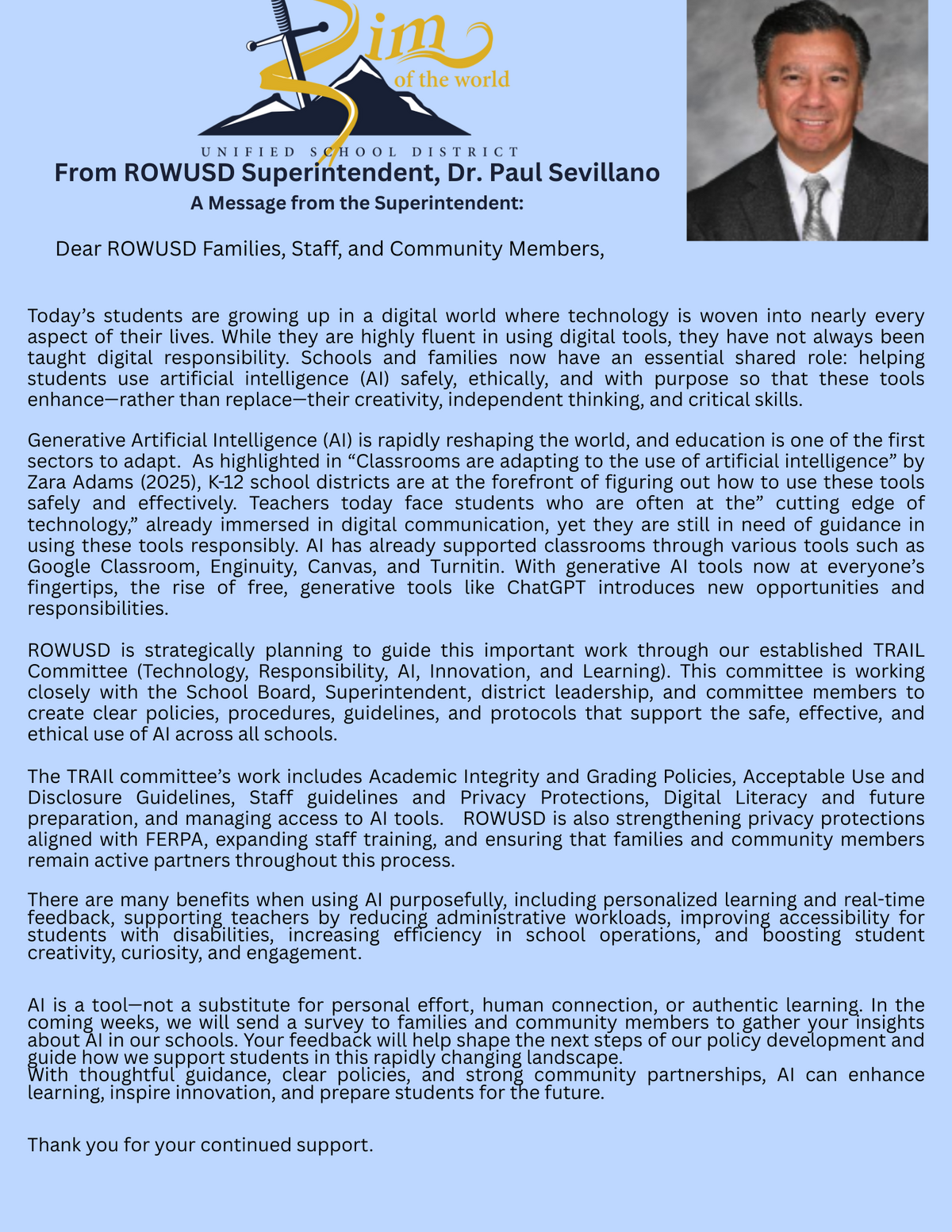 Page 2: From ROWUSD Superintendent, Dr. Paul Sevillano: A Message from the Superintendent: Dear ROWUSD Families, Staff, and Community Members, Today’s students are growing up in a digital world where technology is woven into nearly every aspect of their lives. While they are highly fluent in using digital tools, they have not always been taught digital responsibility. Schools and families now have an essential shared role: helping students use artificial intelligence (AI) safely, ethically, and with purpose so that these tools enhance—rather than replace—their creativity, independent thinking, and critical skills.