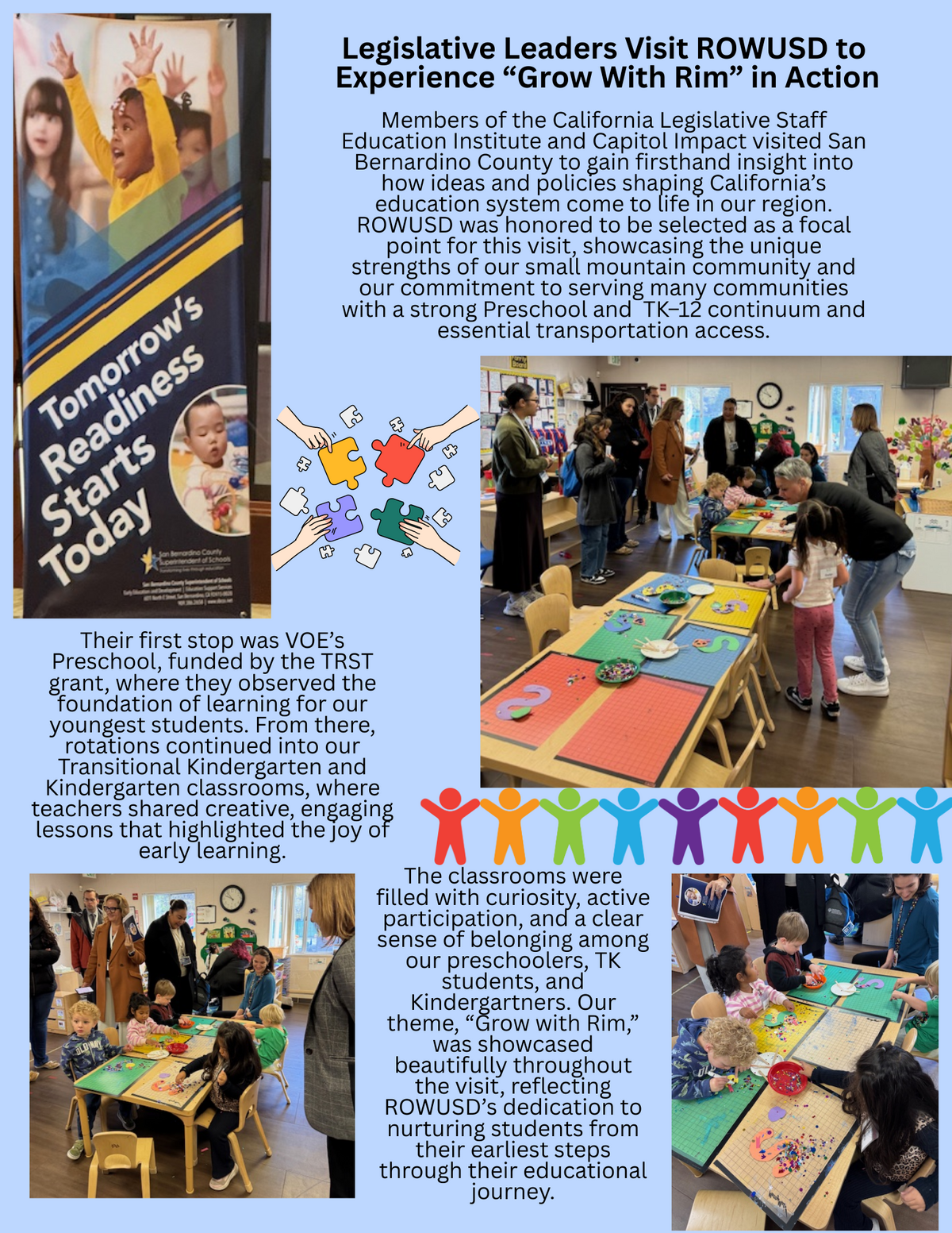 Page 3: Legislative Leaders Visit ROWUSD to Experience “Grow With Rim” in Action. Members of the California Legislative Staff Education Institute and Capitol Impact visited San Bernardino County to gain firsthand insight into how ideas and policies shaping California’s education system come to life in our region. ROWUSD was honored to be selected as a focal point for this visit, showcasing the unique strengths of our small mountain community and our commitment to serving many communities with a strong Preschool and TK–12 continuum and essential transportation access. Their first stop was VOE’s Preschool, funded by the TRST grant, where they observed the foundation of learning for our youngest students. From there, rotations continued into our Transitional Kindergarten and Kindergarten classrooms, where teachers shared creative, engaging lessons that highlighted the joy of early learning. The classrooms were filled with curiosity, active participation, and a clear sense of belonging among our preschoolers, TK students, and Kindergartners. Our theme, “Grow with Rim,” was showcased beautifully throughout the visit, reflecting ROWUSD’s dedication to nurturing students from their earliest steps through their educational journey.