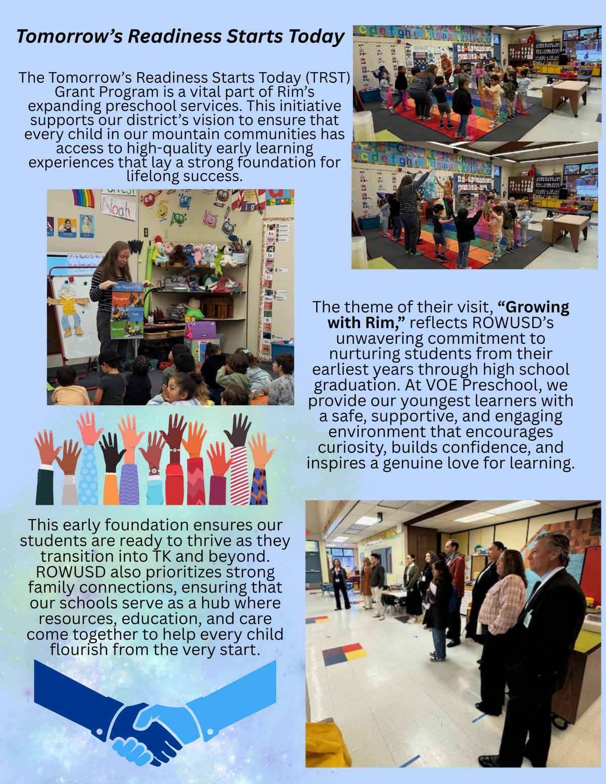 Page 4: The Tomorrow’s Readiness Starts Today (TRST) Grant Program is a vital part of Rim’s expanding preschool services. This initiative supports our district’s vision to ensure that every child in our mountain communities has access to high-quality early learning experiences that lay a strong foundation for lifelong success. The theme of their visit, “Growing with Rim,” reflects ROWUSD’s unwavering commitment to nurturing students from their earliest years through high school graduation. At VOE Preschool, we provide our youngest learners with a safe, supportive, and engaging environment that encourages curiosity, builds confidence, and inspires a genuine love for learning. This early foundation ensures our students are ready to thrive as they transition into TK and beyond. ROWUSD also prioritizes strong family connections, ensuring that our schools serve as a hub where resources, education, and care come together to help every child flourish from the very start.