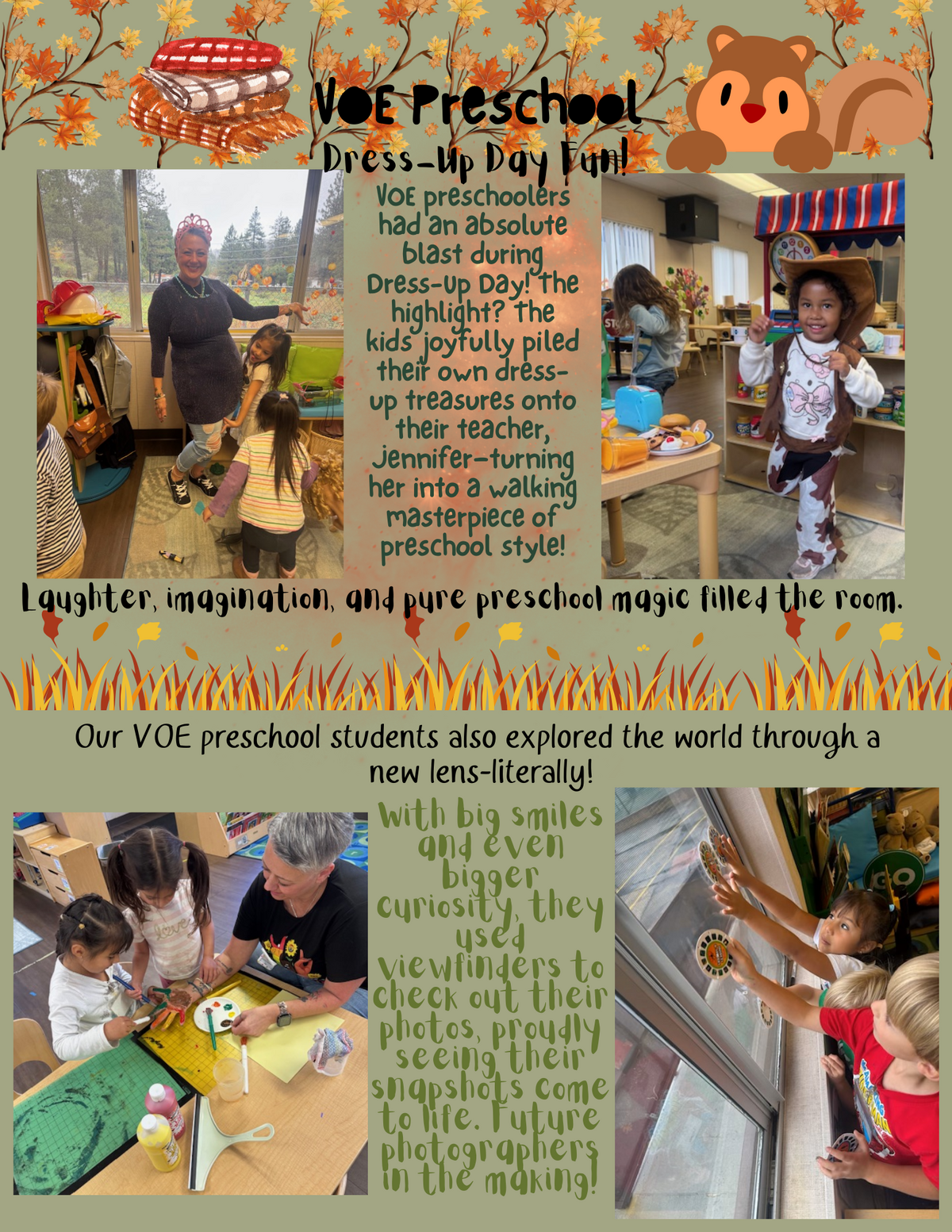 Page 8: VOE Preschool-Dress-Up Day Fun! VOE preschoolers had an absolute blast during Dress-Up Day! The highlight? The kids joyfully piled their own dress-up treasures onto their teacher, Jennifer—turning her into a walking masterpiece of preschool style! Laughter, imagination, and pure preschool magic filled the room. Our VOE preschool students also explored the world through a new lens-literally! With big smiles and even bigger curiosity, they used viewfinders to check out their photos, proudly seeing their snapshots come to life. Future photographers in the making!