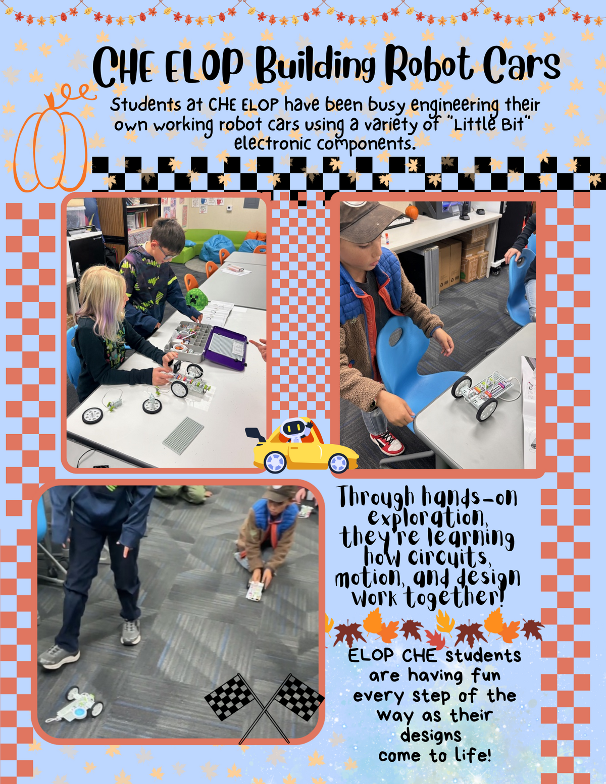 Page 9: CHE ELOP-Building Robot Cars. Through hands-on exploration, they’re learning how circuits, motion, and design work together! ELOP CHE students are having fun every step of the way as their designs come to life!