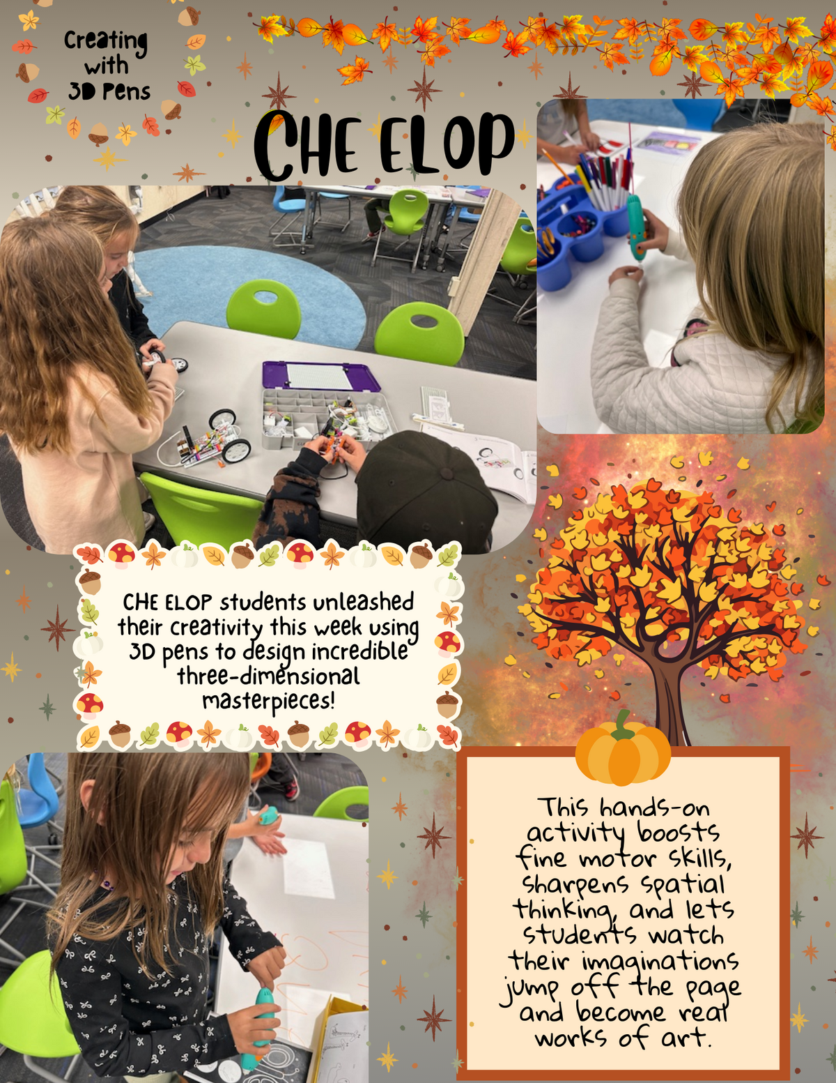 Page 10: CHE ELOP-Creating with 3D Pens. CHE ELOP students unleashed their creativity this week using 3D pens to design incredible three-dimensional masterpieces! This hands-on activity boosts fine motor skills, sharpens spatial thinking, and lets students watch their imaginations jump off the page and become real works of art.