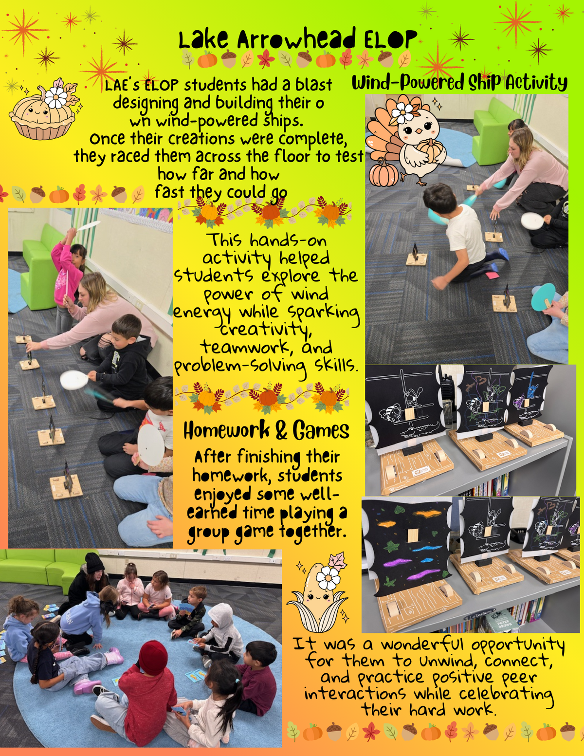 Page 11: Lake Arrowhead ELOP-Wind-Powered Ship Activity. LAE’s ELOP students had a blast designing and building their own wind-powered ships. Once their creations were complete, they raced them across the floor to test how far and how fast they could go. This hands-on activity helped students explore the power of wind energy while sparking creativity, teamwork, and problem-solving skills. Homework & Games. After finishing their homework, students enjoyed some well-earned time playing a group game together. It was a wonderful opportunity for them to unwind, connect, and practice positive peer interactions while celebrating their hard work.