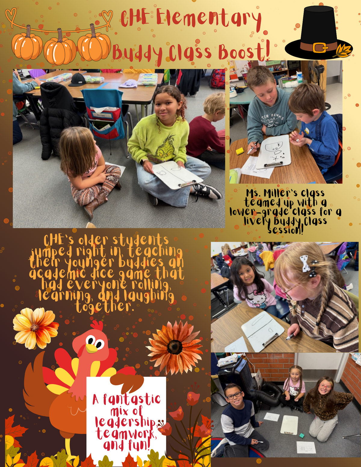 Page 13: CHE Elementary Buddy Class Boost! Ms. Miller’s class teamed up with a lower-grade class for a lively Buddy Class session! CHE’s older students jumped right in, teaching their younger buddies an academic dice game that had everyone rolling, learning, and laughing together. A fantastic mix of leadership, teamwork, and fun!