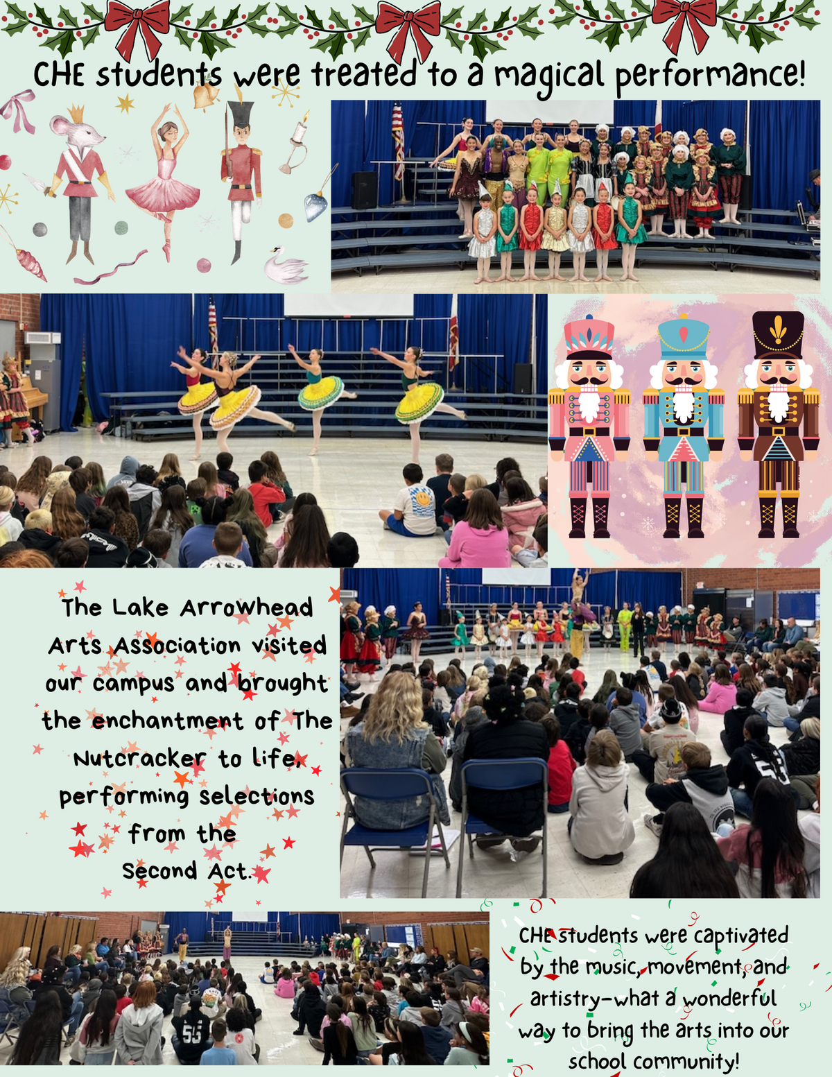 Page 15: CHE students were treated to a magical performance! The Lake Arrowhead Arts Association visited our campus and brought the enchantment of The Nutcracker to life, performing selections from the Second Act. CHE students were captivated by the music, movement, and artistry—what a wonderful way to bring the arts into our school community!