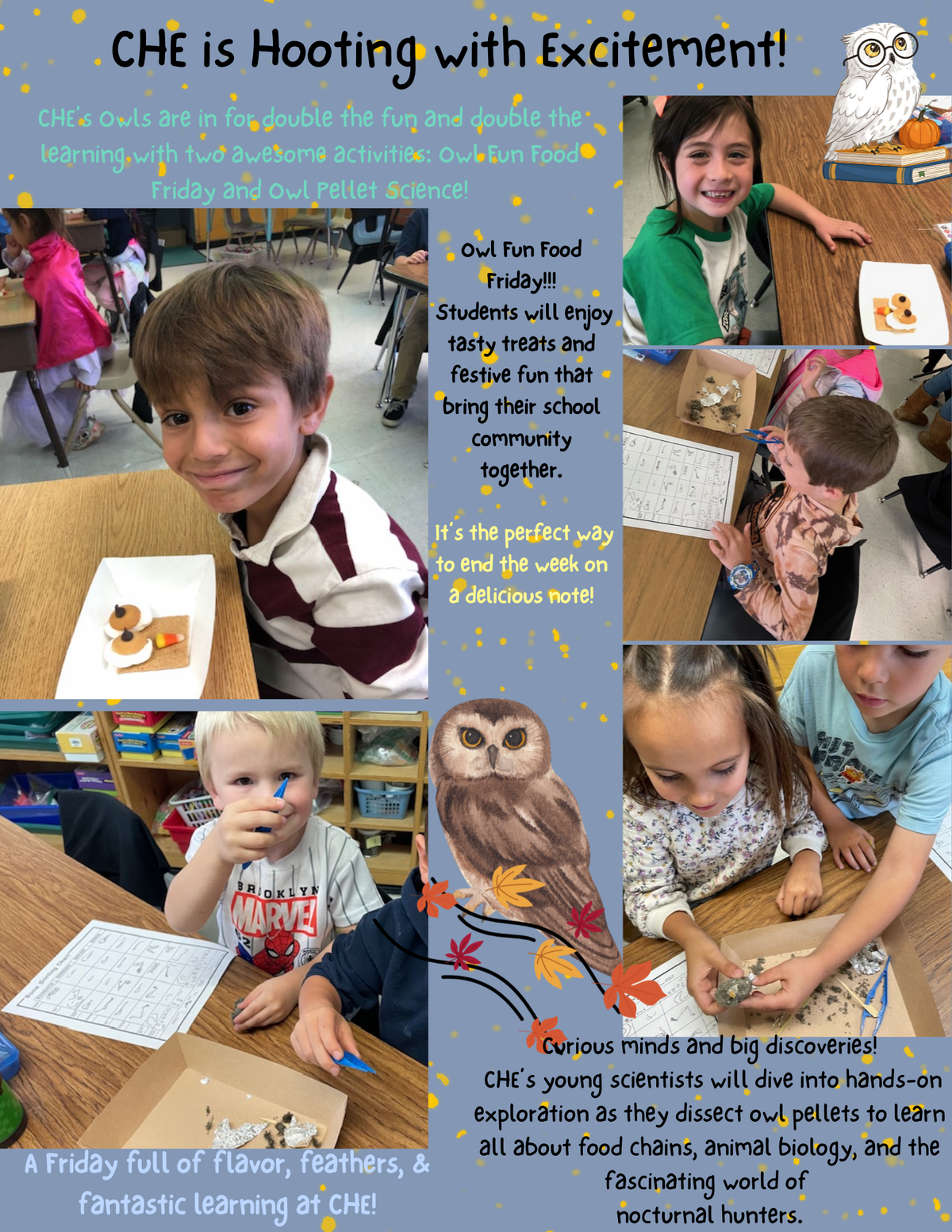 Page 14: CHE is Hooting with Excitement! CHE’s Owls are in for double the fun and double the learning with two awesome activities: Owl Fun Food Friday and Owl Pellet Science! Owl Fun Food Friday!!! Curious minds and big discoveries! CHE’s young scientists will dive into hands-on exploration as they dissect owl pellets to learn all about food chains, animal biology, and the fascinating world of nocturnal hunters. Students will enjoy tasty treats and festive fun that bring their school community together. It’s the perfect way to end the week on a delicious note! A Friday full of flavor, feathers, & fantastic learning at CHE!