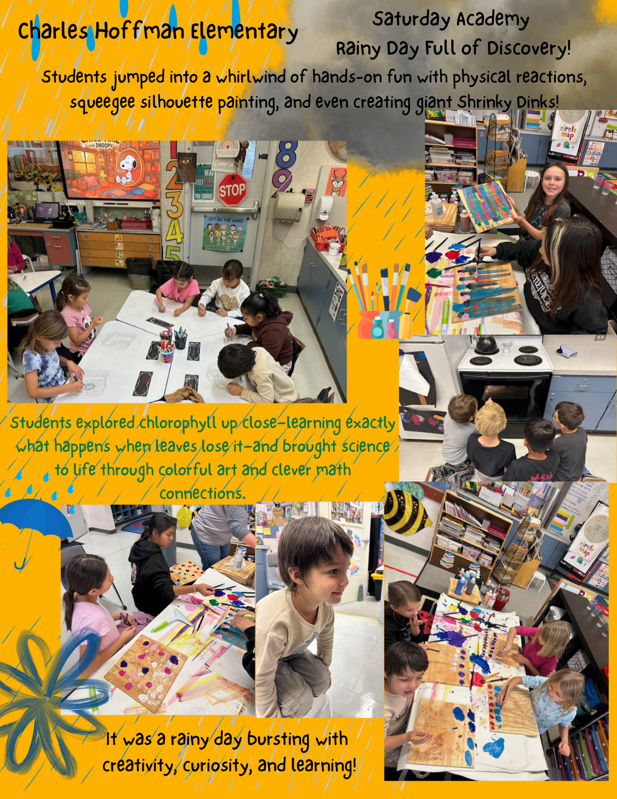 Page 16: Charles Hoffman Elementary-Saturday Academy Rainy Day Full of Discovery! Students jumped into a whirlwind of hands-on fun with physical reactions, squeegee silhouette painting, and even creating giant Shrinky Dinks! Students explored chlorophyll up close—learning exactly what happens when leaves lose it—and brought science to life through colorful art and clever math connections. It was a rainy day bursting with creativity, curiosity, and learning!