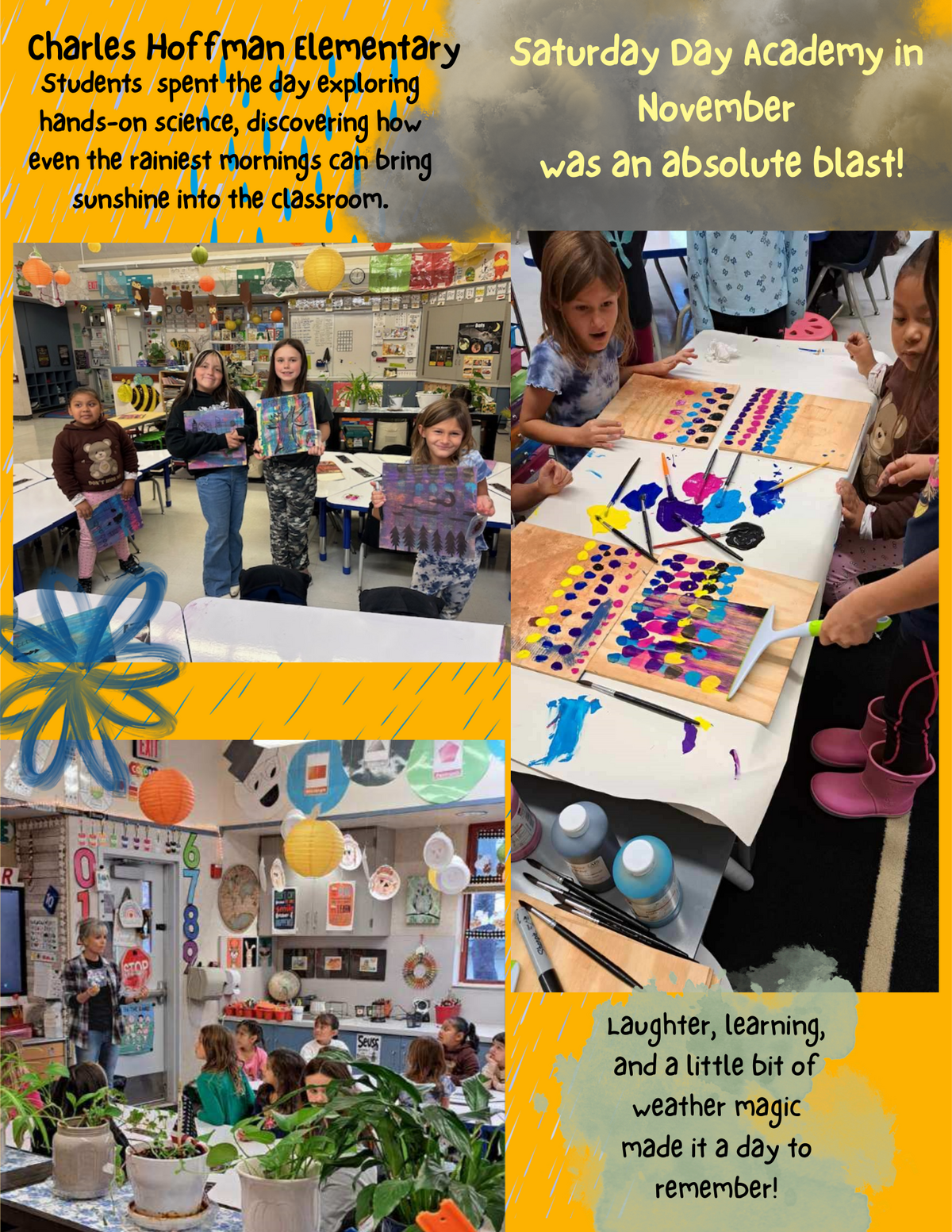 Page 17: Charles Hoffman Elementary-Saturday Day Academy in November. It was an absolute blast! Students spent the day exploring hands-on science, discovering how even the rainiest mornings can bring sunshine into the classroom. Laughter, learning, and a little bit of weather magic made it a day to remember!