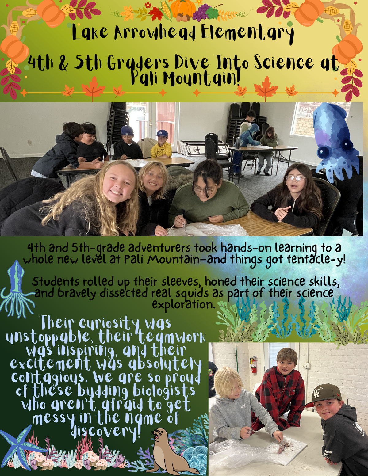 Page 18: Lake Arrowhead Elementary-4th & 5th Graders Dive Into Science at Pali Mountain! 4th and 5th-grade adventurers took hands-on learning to a whole new level at Pali Mountain—and things got tentacle-y! Students rolled up their sleeves, honed their science skills, and bravely dissected real squids as part of their science exploration. Their curiosity was unstoppable, their teamwork was inspiring, and their excitement was absolutely contagious. We are so proud of these budding biologists who aren’t afraid to get messy in the name of discovery!