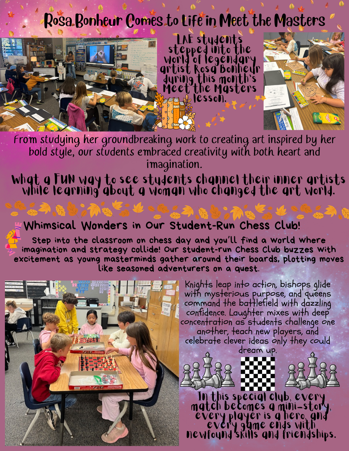 Page 19: Rosa Bonheur Comes to Life in Meet the Masters. LAE students stepped into the world of legendary artist Rosa Bonheur during this month’s Meet the Masters lesson. From studying her groundbreaking work to creating art inspired by her bold style, our students embraced creativity with both heart and imagination. What a FUN way to see students channel their inner artists while learning about a woman who changed the art world. Whimsical Wonders in Our Student-Run Chess Club!