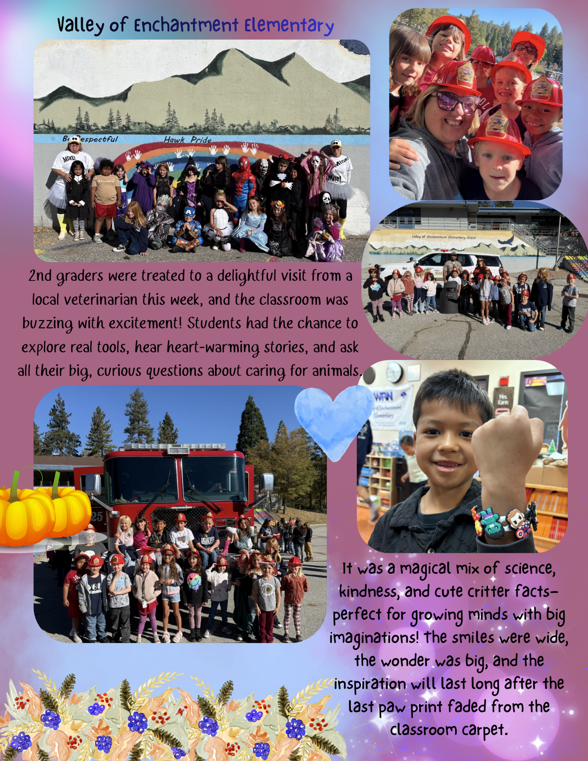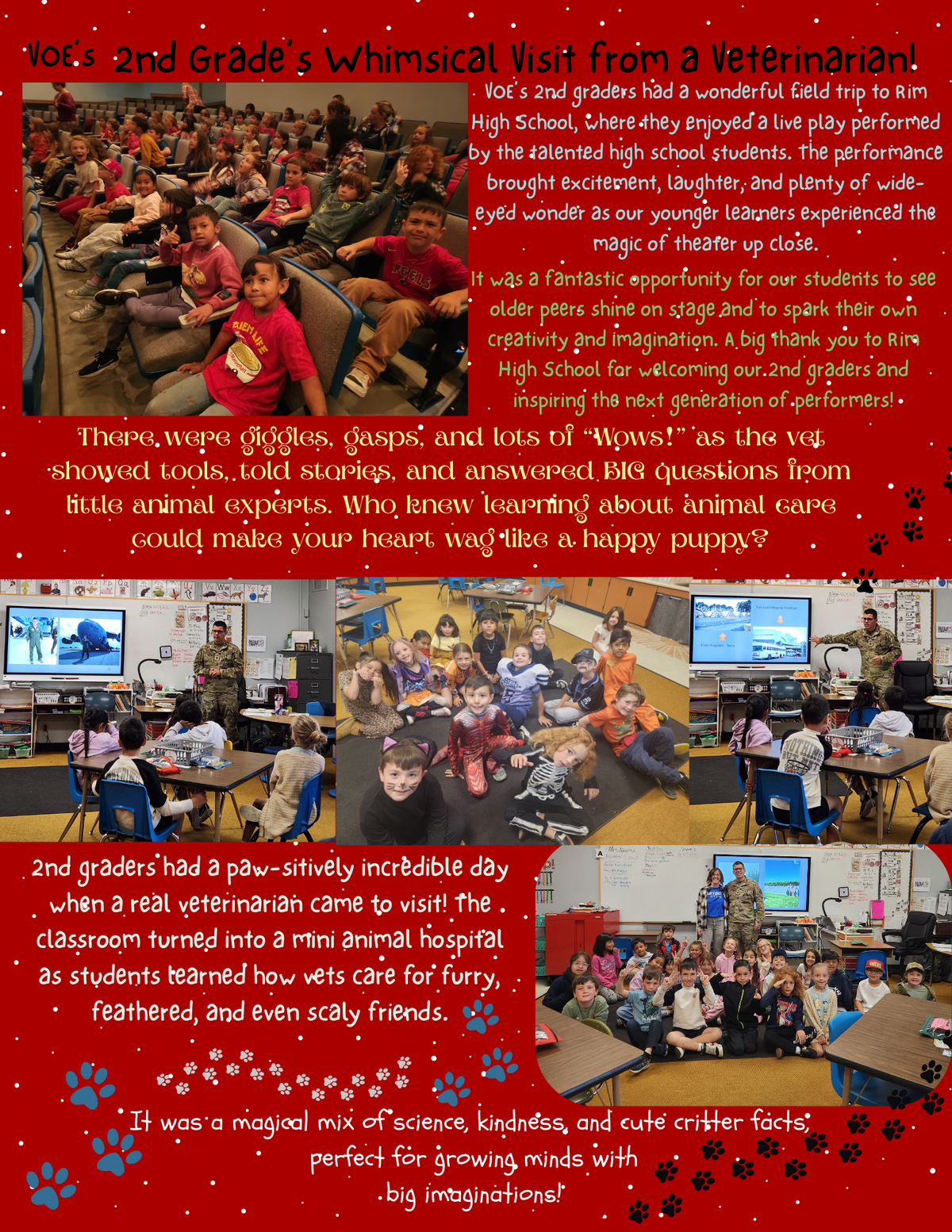 Page 24: VOE’s 2nd Grade’s Whimsical Visit from a Veterinarian! VOE’s 2nd graders had a wonderful field trip to Rim High School, where they enjoyed a live play performed by the talented high school students. The performance brought excitement, laughter, and plenty of wide-eyed wonder as our younger learners experienced the magic of theater up close. It was a fantastic opportunity for our students to see older peers shine on stage and to spark their own creativity and imagination. A big thank you to Rim High School for welcoming our 2nd graders and inspiring the next generation of performers! There were giggles, gasps, and lots of “Wows!” as the vet showed tools, told stories, and answered BIG questions from little animal experts. Who knew learning about animal care could make your heart wag like a happy puppy? 2nd graders had a paw-sitively incredible day when a real veterinarian visited! The classroom turned into a mini animal hospital as students learned how vets care for furry, feathered, and even scaly friends. It was a magical mix of science, kindness, and cute critter facts, perfect for growing minds with big imaginations!
