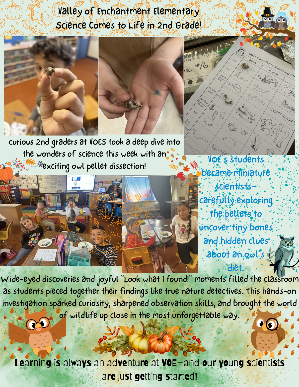 Science Comes to Life in 2nd Grade! Curious 2nd graders at VOES took a deep dive into the wonders of science this week with an exciting owl pellet dissection! VOE’s students became miniature scientists—carefully exploring the pellets to uncover tiny bones and hidden clues about an owl’s diet. Wide-eyed discoveries and joyful “Look what I found!” moments filled the classroom as students pieced together their findings like true nature detectives. This hands-on investigation sparked curiosity, sharpened observation skills, and brought the world of wildlife up close in the most unforgettable way. Learning is always an adventure at VOE—and our young scientists are just getting started!