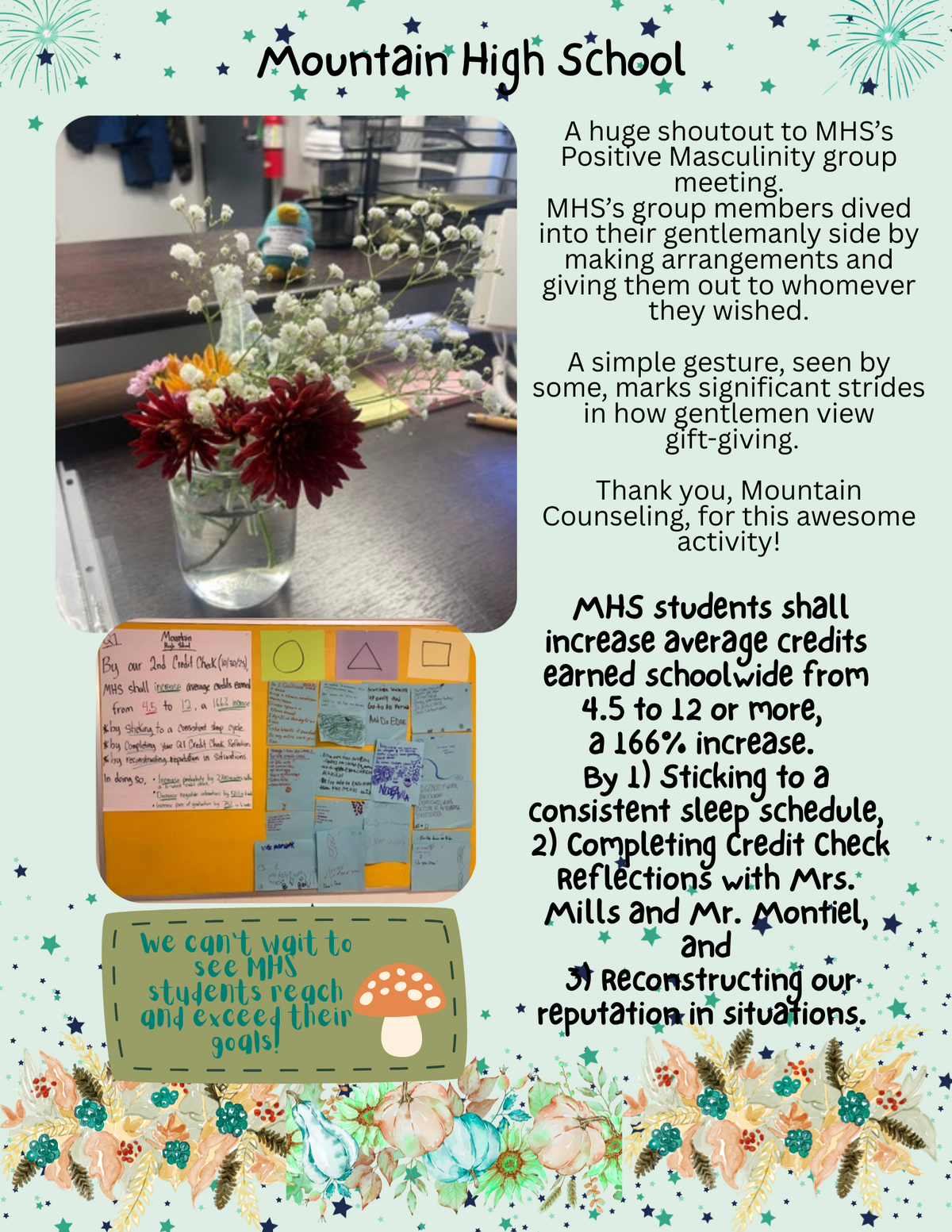 gift-giving. Thank you, Mountain Counseling, for this awesome activity! MHS students shall increase average credits earned schoolwide from 4.5 to 12 or more,