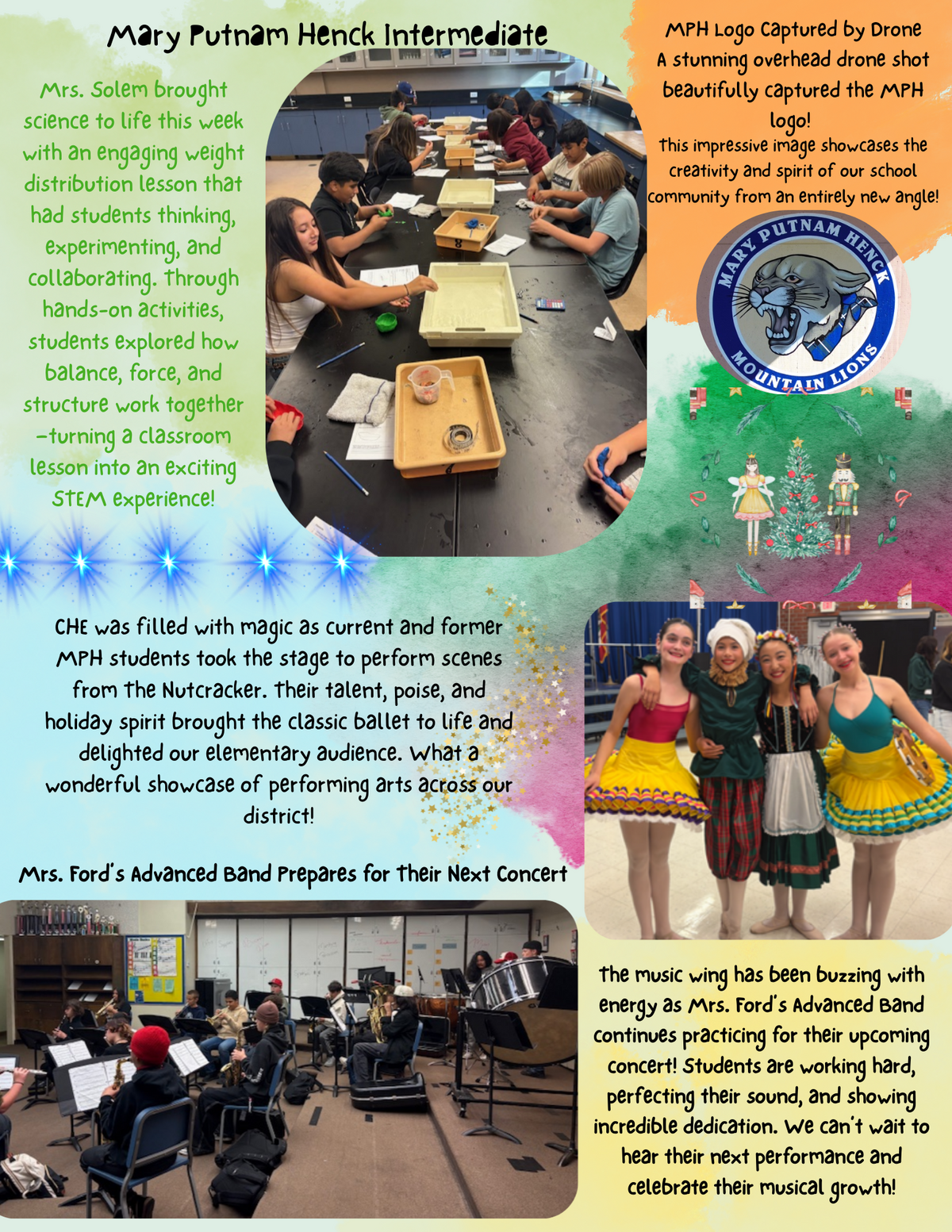 Page 26: Mary Putnam Henck Intermediate. Mrs. Solem brought science to life this week with an engaging weight distribution lesson that had students thinking, experimenting, and collaborating. Through hands-on activities, students explored how balance, force, and structure work together—turning a classroom lesson into an exciting STEM experience! MPH Logo Captured by Drone A stunning overhead drone shot captured the MPH logo beautifully! This impressive image showcases the creativity and spirit of our school community from an entirely new angle! CHE was filled with magic as current and former MPH students took the stage to perform scenes from The Nutcracker. Their talent, poise, and holiday spirit brought the classic ballet to life and delighted our elementary audience. What a wonderful showcase of performing arts across our district! The music wing has been buzzing with energy as Mrs. Ford’s Advanced Band continues practicing for their upcoming concert! Students are working hard, perfecting their sound, and showing incredible dedication. We can’t wait to hear their next performance and celebrate their musical growth!