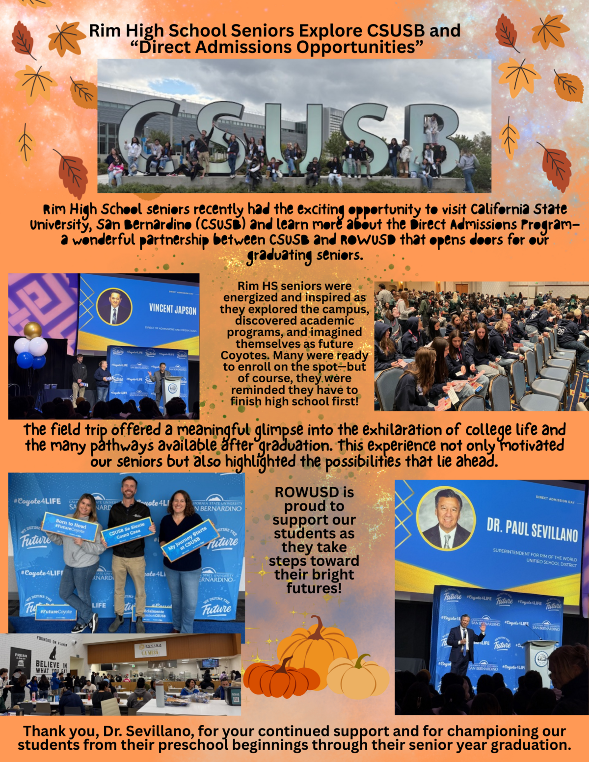 Page 7: Rim High School Seniors Explore CSUSB and “Direct Admissions Opportunities” Rim High School seniors recently had the exciting opportunity to visit California State University, San Bernardino (CSUSB) and learn more about the Direct Admissions Program—a wonderful partnership between CSUSB and ROWUSD that opens doors for our graduating seniors. Rim HS seniors were energized and inspired as they explored the campus, discovered academic programs, and imagined themselves as future Coyotes. Many were ready to enroll on the spot—but of course, they were reminded they have to finish high school first! The field trip offered a meaningful glimpse into the exhilaration of college life and the many pathways available after graduation. This experience not only motivated our seniors but also highlighted the possibilities that lie ahead. ROWUSD is proud to support our students as they take steps toward their bright futures! Thank you, Dr. Sevillano, for your continued support and for championing our students from their preschool beginnings through their senior year graduation.