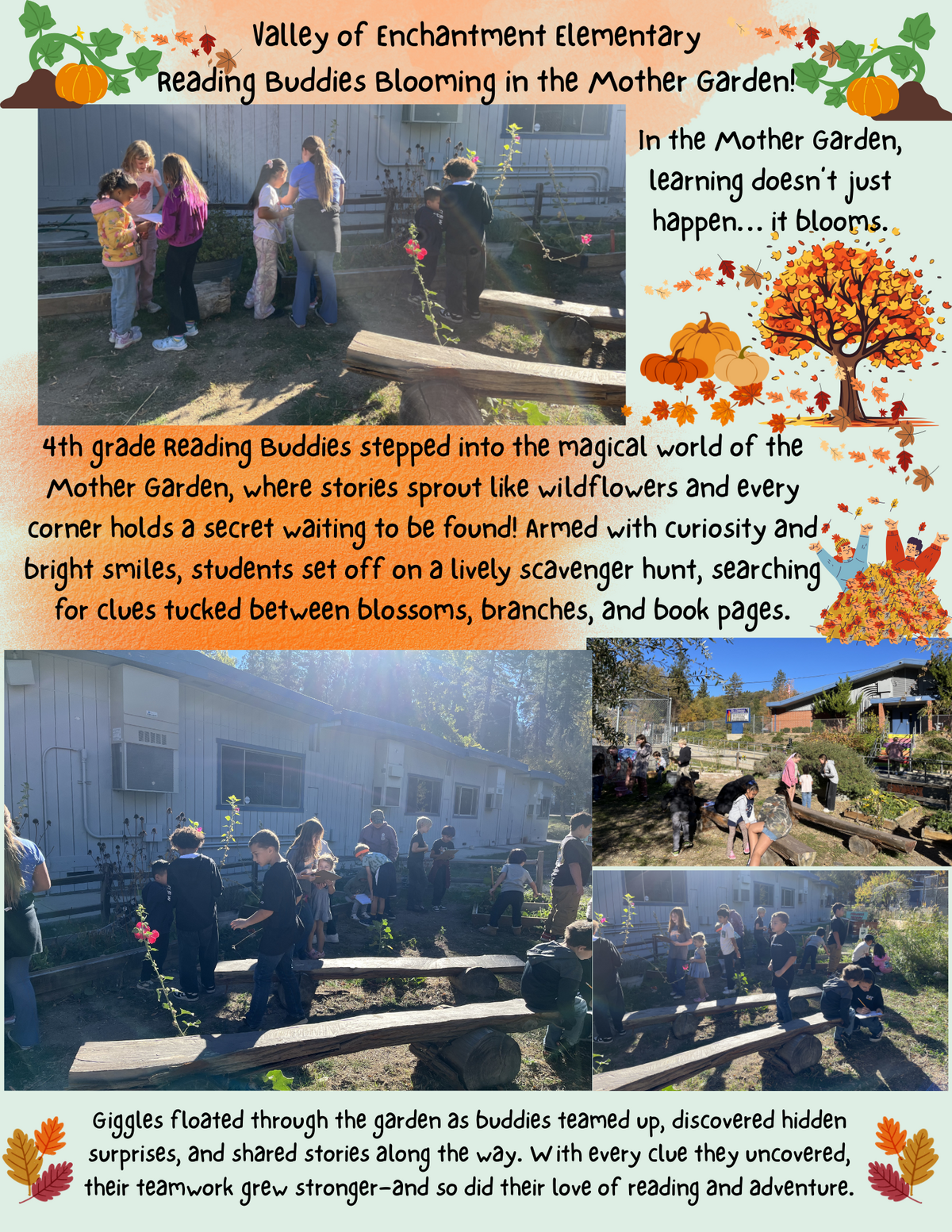 Page 22: Valley of Enchantment Elementary Reading Buddies Blooming in the Mother Garden! In the Mother Garden, learning doesn’t just happen… it blooms. 4th-grade Reading Buddies stepped into the magical world of the Mother Garden, where stories sprout like wildflowers and every corner holds a secret waiting to be found! Armed with curiosity and bright smiles, students set off on a lively scavenger hunt, searching for clues tucked between blossoms, branches, and book pages.