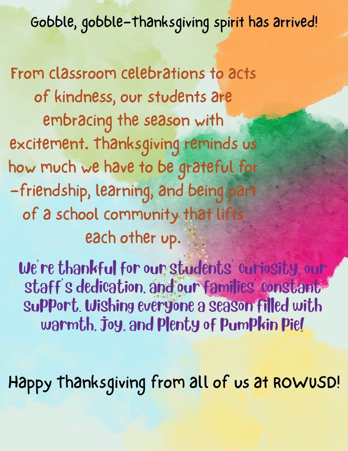 Page 28: Gobble, gobble—Thanksgiving spirit has arrived! From classroom celebrations to acts of kindness, our students are embracing the season with excitement. Thanksgiving reminds us how much we have to be grateful for—friendship, learning, and being part of a school community that lifts each other up. We’re thankful for our students’ curiosity, our staff’s dedication, and our families’ constant support. Wishing everyone a season filled with warmth, joy, and plenty of pumpkin pie!Happy Thanksgiving from all of us at ROWUSD!