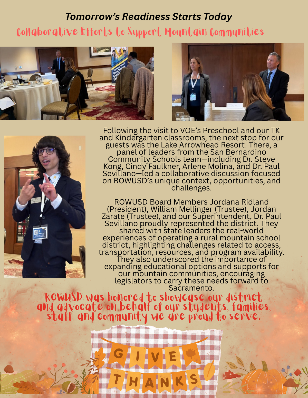 Page 5: Tomorrow’s Readiness Starts Today-Collaborative Efforts to Support Mountain Communities. Following the visit to VOE’s Preschool and our TK and Kindergarten classrooms, our guests' next stop was the Lake Arrowhead Resort. There, a panel of leaders from the San Bernardino Community Schools team—including Dr. Steve Kong, Cindy Faulkner, Arlene Molina, and Dr. Paul Sevillano—led a collaborative discussion focused on ROWUSD’s unique context, opportunities, and challenges. ROWUSD Board Members Jordana Ridland (President), William Mellinger (Trustee), Jordan Zarate (Trustee), and our Superintendent, Dr. Paul Sevillano, proudly represented the district. They shared with state leaders the real-world experiences of operating a rural mountain school district, highlighting challenges related to access, transportation, resources, and program availability. They also underscored the importance of expanding educational options and supports for our mountain communities, encouraging legislators to carry these needs forward to Sacramento. ROWUSD was honored to showcase our district and advocate on behalf of our students, families, staff, and community. We are proud to serve.