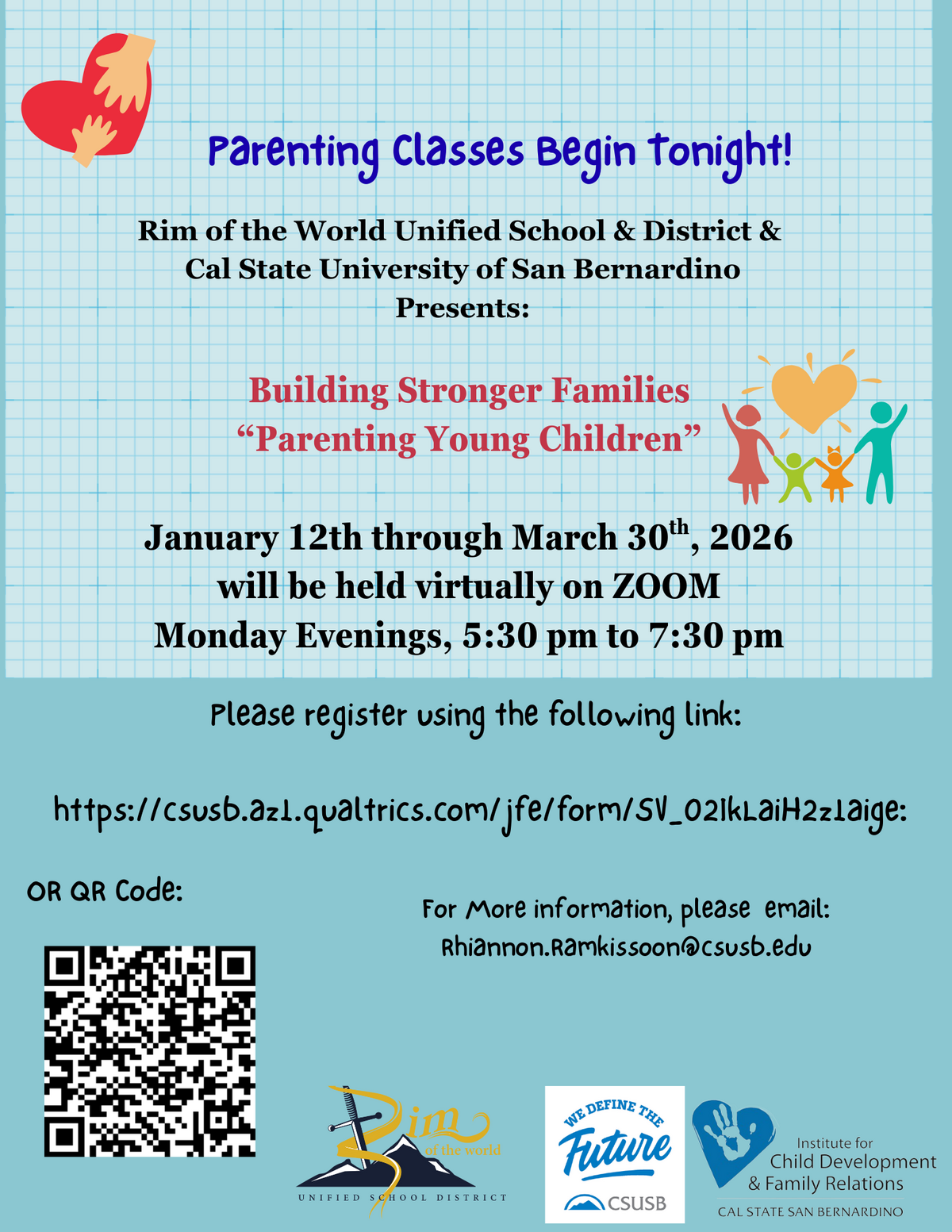 Page: Parenting Classes Begin Tonight! Rim of the World Unified School District & Cal State University of San Bernardino Presents: Building Stronger Families "Parenting Young Children." January 12th through March 30th, 2026, will be held virtually on Zoom. Monday evenings, 5:30 pm to 7:30 pm.