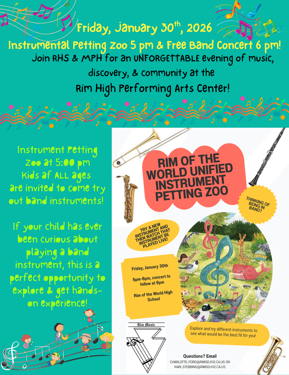 Page: Friday, January 30th, 2026- Instrumental Petting Zoo 5 pm & Free Band Concert 6 pm! Join RHS & MPH for an UNFORGETTABLE evening of music, discovery, & community at the Rim High Performing Arts Center! Instrument Petting Zoo at 5:00 pm. Kids af ALL ages