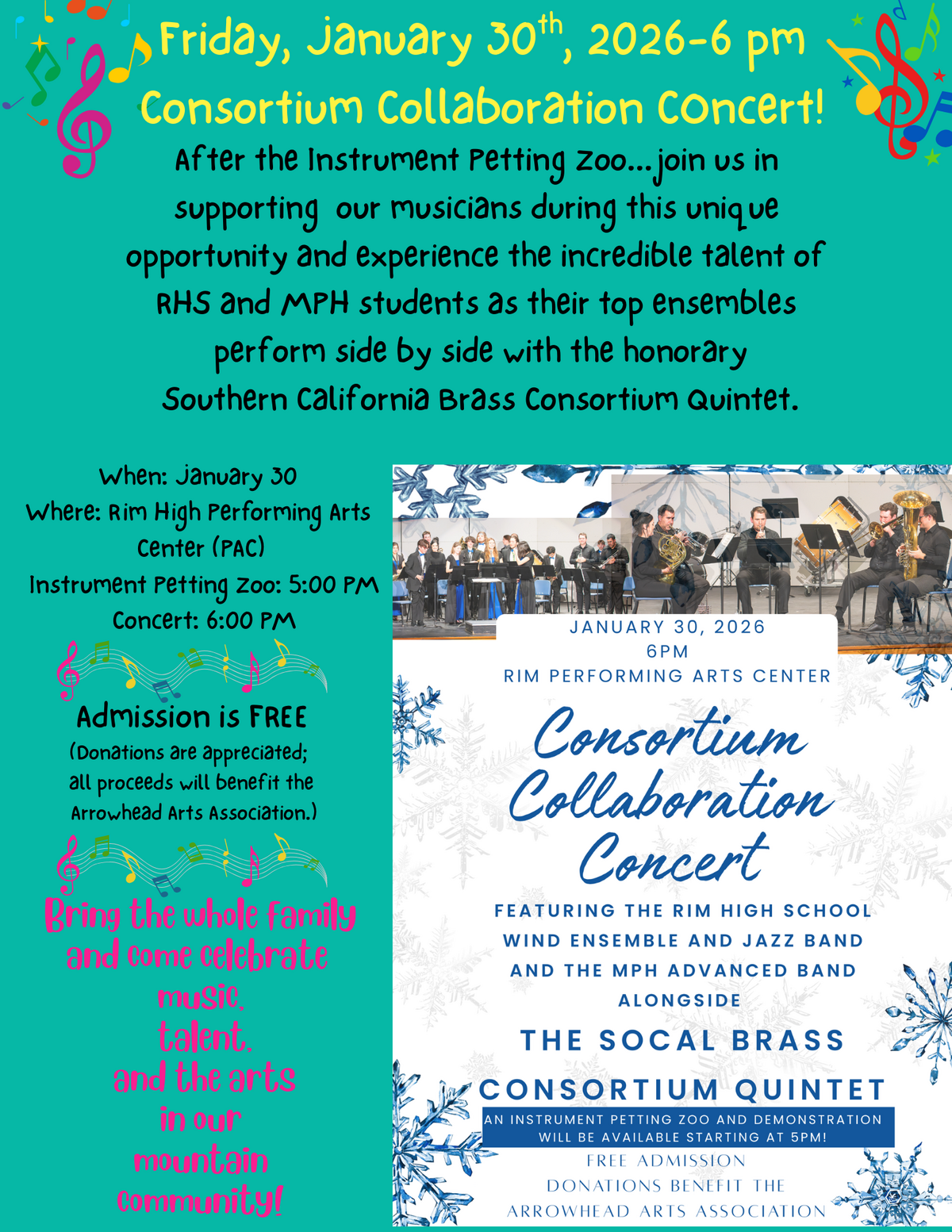 Page: Friday, January 30th, 2026-6 pm Consortium Collaboration Concert! After the Instrument Petting Zoo...join us in supporting our musicians during this unique opportunity and experience the incredible talent of RHS and MPH students as their top ensembles perform side by side with the honorary Southern California Brass Consortium Quintet. When: January 30 Where: Rim High Performing Arts Center (PAC) Instrument Petting Zoo: 5:00 PM Concert: 6:00 PM. Admission is FREE. (Donations are appreciated; All proceeds will benefit the Arrowhead Arts Association.) Bring the whole family and come celebrate music, talent, and the arts in our mountain community! Picture: January 30, 2026, 6 pm-Rim Performing Arts Center Consortium Collaboration Concert. Featuring the Rim High School Wind Ensemble and Jazz Band, and the MPH Advanced Band, alongside the Social Brass Consortium Quintet. An instrument Petting Zoo and demonstration will be available starting at 5 pm! Free Admission. Donations will benefit the Arrowhead Arts Association.