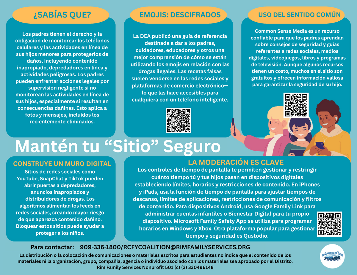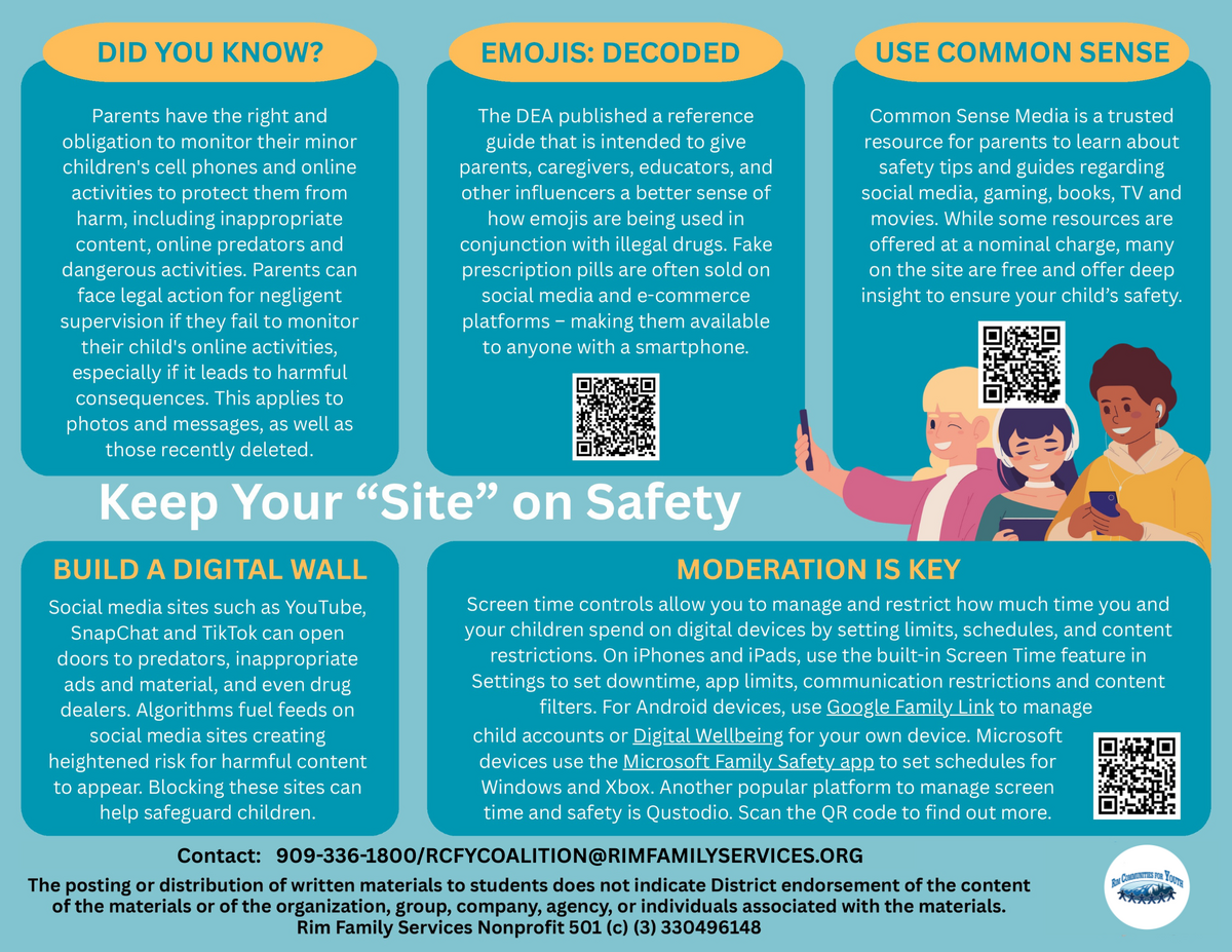 Page: Social Media Safety: Do You Know: Parents have the right and obligation to monitor their minor children's cell phones and online activities to protect them from harm, including exposure to inappropriate content, online predators, and dangerous activities. Parents may face legal action for negligent supervision if they fail to monitor their child's online activities, especially when those activities result in harmful consequences. This applies to photos and messages, including those recently deleted. Emojis: Decoded- The DEA published a reference guide that is intended to give parents, caregivers, educators, and other influencers a better sense of how emojis are being used in conjunction with illegal drugs. Fake prescription pills are often sold on social media and e-commerce platforms, making them available to anyone with a smartphone. Use Common Sense: Common Sense Media is a trusted resource for parents to learn about safety tips and guides regarding social media, gaming, books, TV, and movies. While some resources are offered at a nominal cost, many on the site are free and provide in-depth insights to help ensure your child's safety. Keep Your "Site" on Safety: Build a Digital Wall: Social media platforms such as YouTube, Snapchat, and TikTok can expose users to predators, inappropriate content, and even drug dealers. Algorithms fuel feeds on social media sites, creating a heightened risk that harmful content will appear. Blocking these sites can help safeguard children. Moderation is Key: Screen time controls allow you to manage and restrict how much time you and your children spend ondigital devices by setting limits, schedules, and content restrictions. On iPhones and iPads, use the built-in Screen Time feature in Settings to set downtime, app limits, communication restrictions, and content filters. For Android filters, use Google Family Link to manage child accounts or Digital Wellbeing for your own device. Microsoft devices use the Microsoft Family Safety app to set a schedule for Windows and Xbox. Another popular platform to manage screen time and safety is Qustodio. Scan the QR code to find out more. Contact 909-336-1800/RCFYCOALITION@RIMFAMILYSERVICES.org The posting or distribution of written materials to students does not indicate District endorsement of the content of the materials of the organization, group, company, agency, or individuals associated with the materials. Rim Family Services Nonprofit501(c) (3) 330496148