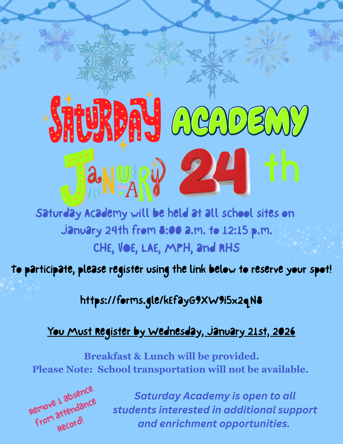 You Must Register by Wednesday, January 21st, 2026. Breakfast & Lunch will be provided. Please note: School transportation will not be available. Saturday Academy is open to all students interested in additional support and enrichment opportunities. Remove 1 absence from the attendance Record!