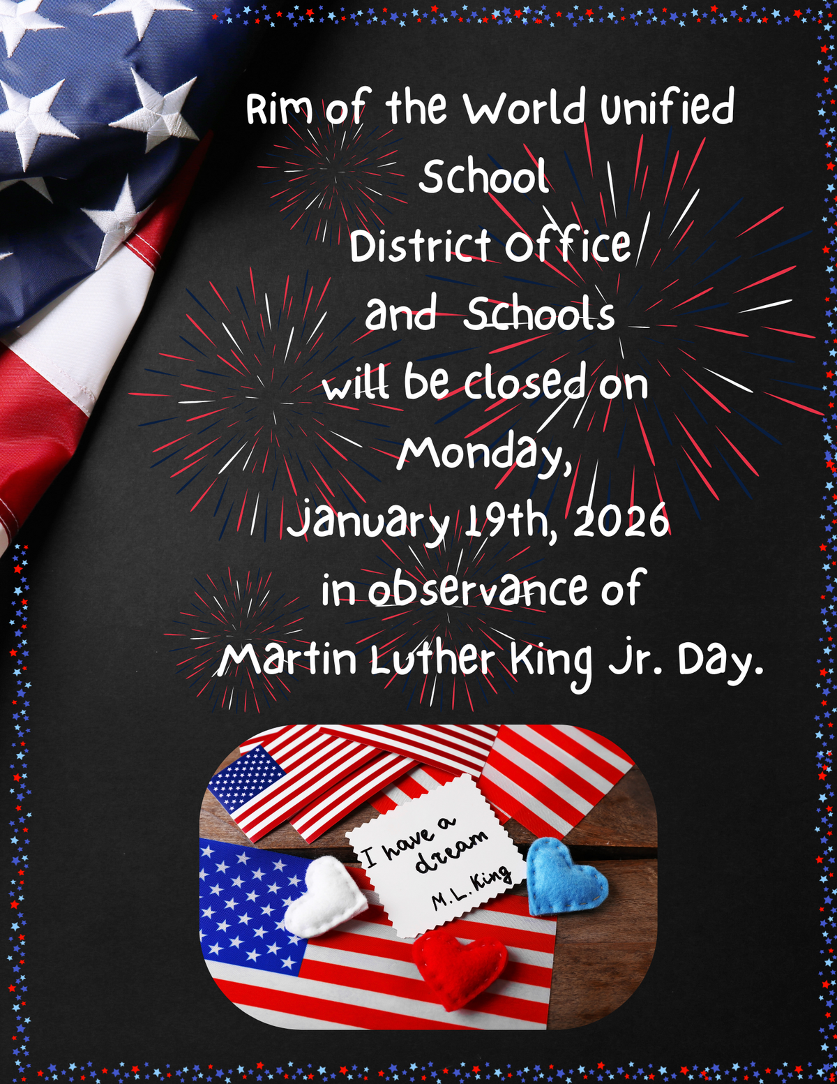 Page: Rim of the World Unified School District Office and Schools will be closed on Monday, January 19th, 2026, in observance of Martin Luther King Jr. Day.