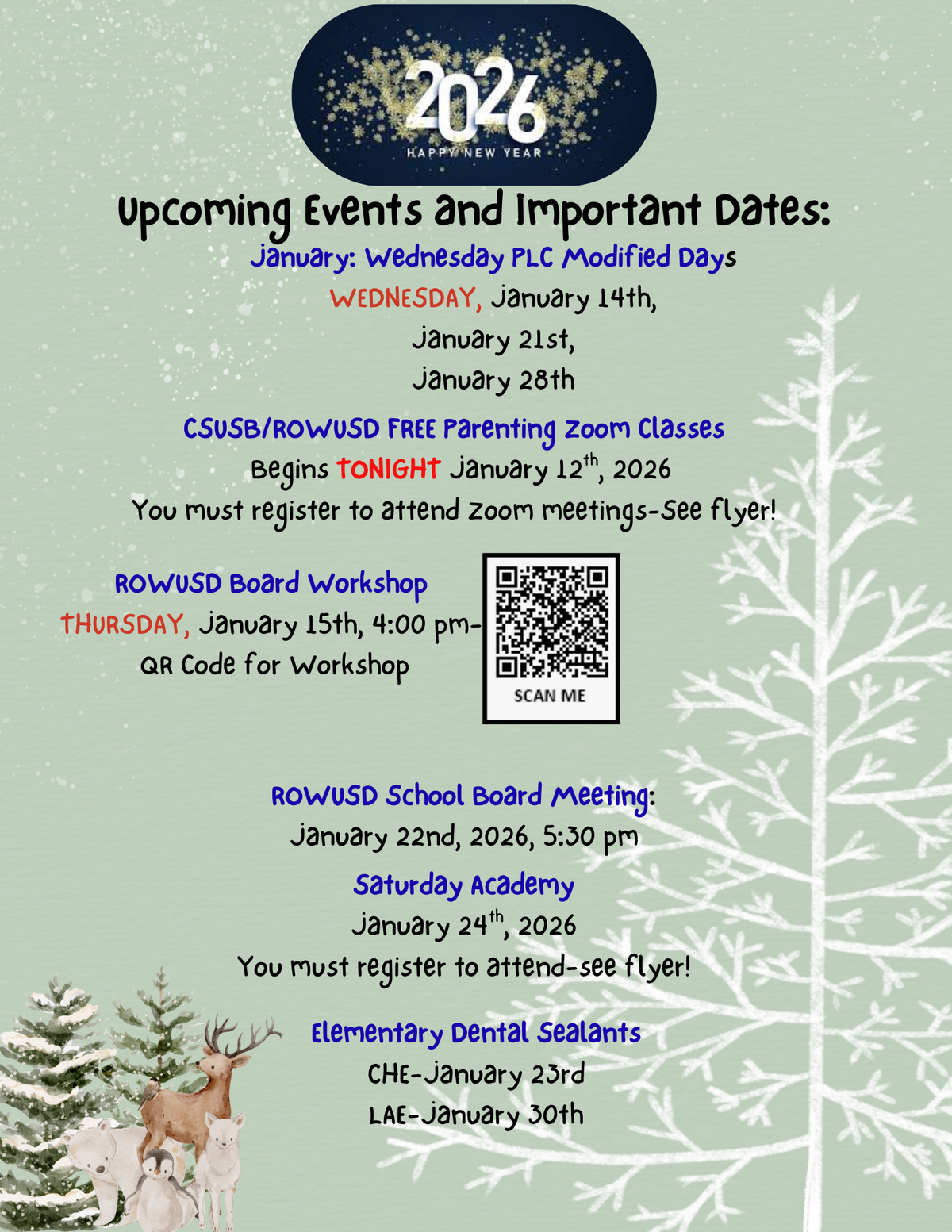 Page: Upcoming Events and Important Dates: January: Wednesday PLC Modified Days. Wednesday, January 14th, January 21st and 28th. CSUSB/ROWUSD FREE Parenting Zoom Classes. Begins TONIGHT, January 12th, 2026. You must register to attend Zoom meetings-See flyer! ROWUSD Board Workshop