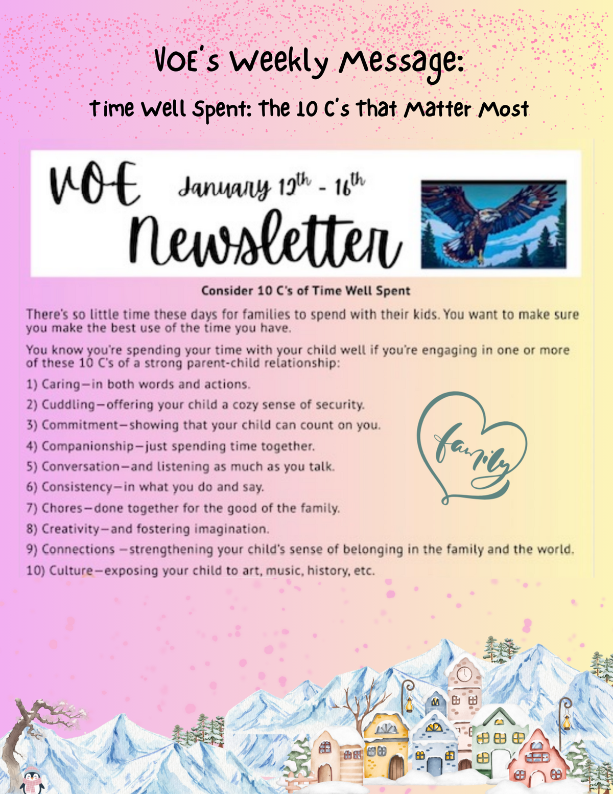 Page: VOE's Weekly Message: Time Well Spent: The 10 C's That Matter Most! VOE January 12th-16th Voe Newsletter. Consider 10 C's of Time Wlss Spent: