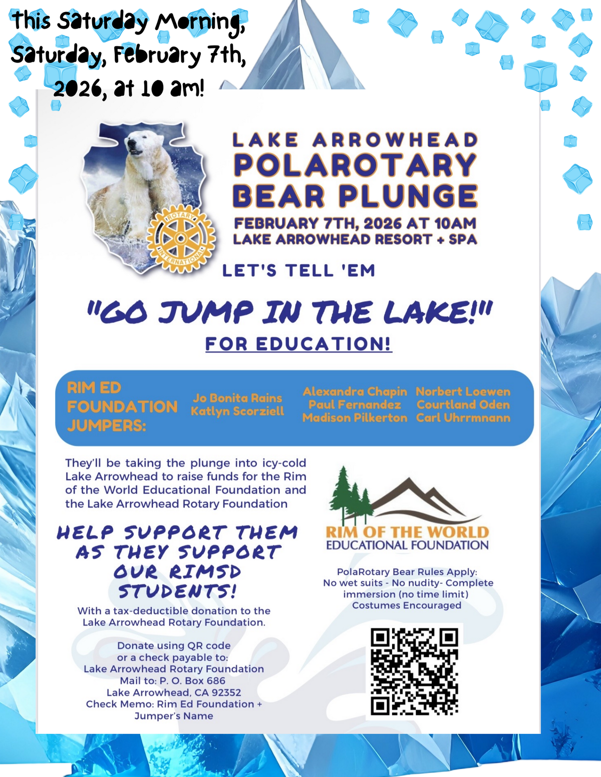 Page: This Saturday Morning, Saturday, February 7th, 2026, at 10 am! Lake Arrowhead Polarotary Bear Plunge. February 7th, 2026, at 10 am. Lake Arrowhead Resort and Spa. Let's Tell 'Em "Go Jump In The Lake!" for Education! Rim Ed Foundation Jumpers: Jo Bonita Rains, Katlyn Scorziell, Alexandra Chapin, Paul Fernandez, Madison Pinkerton, Norbert Loewen, Courtland Oden, Carl Uhrrmnann.  They'll be taking the plunge into the icy cold Lake Arrowhead to raise funds for the Rim of the World Educational Foundation and the Lake Arrowhead Rotary Foundation. Help support them as they support our RIMSD Students! With a tax-deductible donation to the Lake Arrowhead Rotary Foundation. Donate using QR Code of a check payable to: Lake Arrowhead Rotary Foundation. Mail to: PO Box 686, Lake Arrowhead, CA 92352. Check memo: Rim Ed Foundation + Jumper's Name. Rom of the World Education Foundation. PolaRotary Bear Rules apply: No wet suits, no nudity, Complete immersion (no time limit). Costumes encouraged.