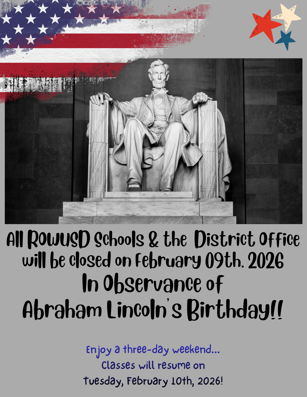 Page: All ROWUSD Schools & the  District Office will be closed on February 09th, 2026, In Observance of Abraham Lincoln’s Birthday!! Enjoy a three-day weekend...