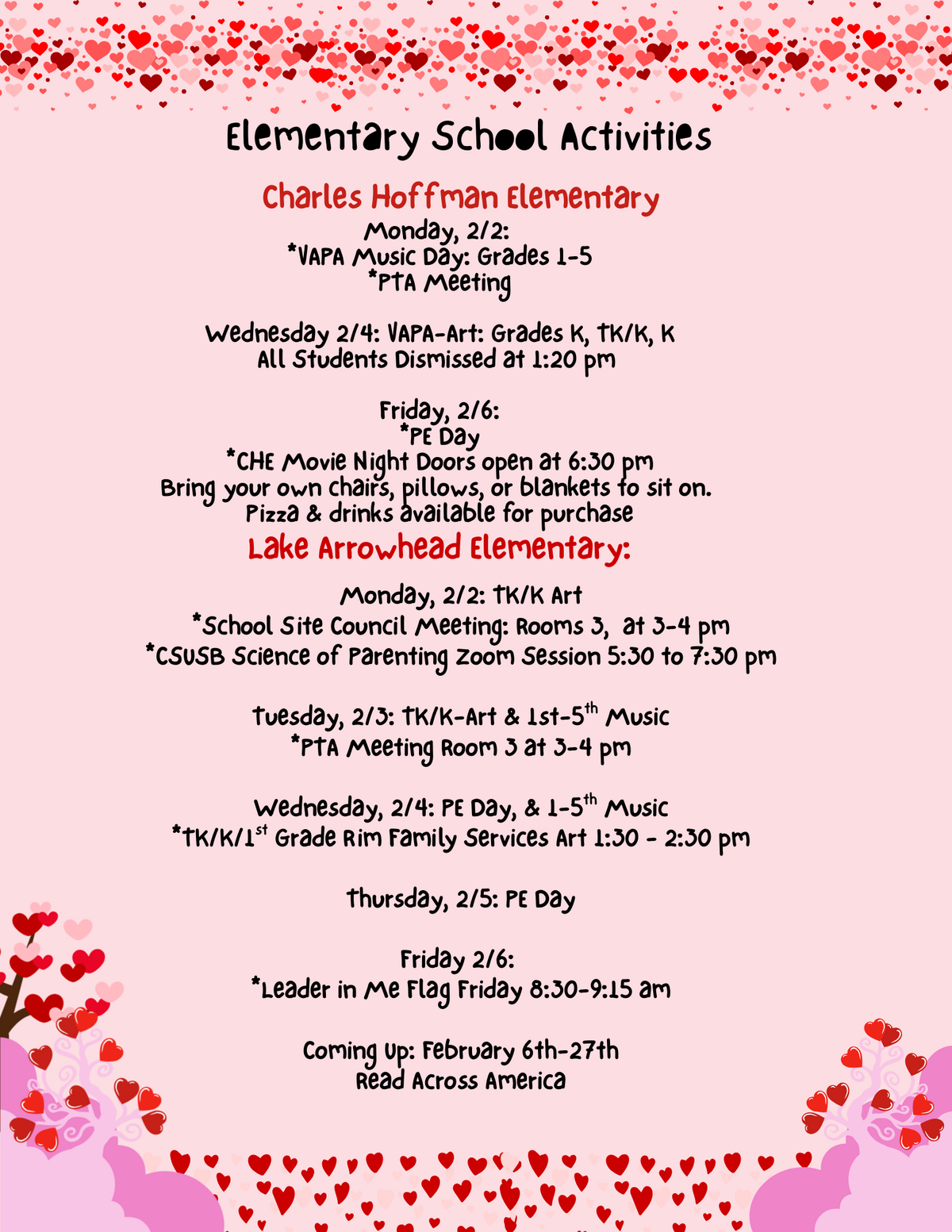 Lake Arrowhead: Monday, 2/2: TK/K Art *School Site Council Meeting: Rooms 3,  at 3-4 pm *CSUSB Science of Parenting Zoom Session 5:30 to 7:30 pm