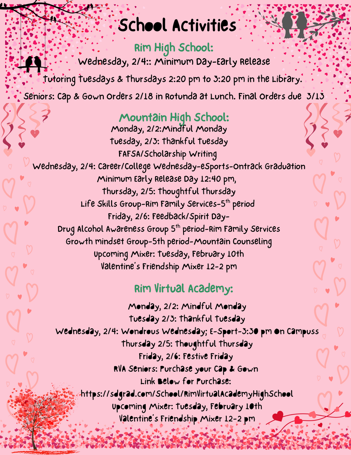 Page: Rim High School: Wednesday, 2/4:: Minimum Day-Early Release, Tutoring Tuesdays & Thursdays 2:20 pm to 3:20 pm in the Library.