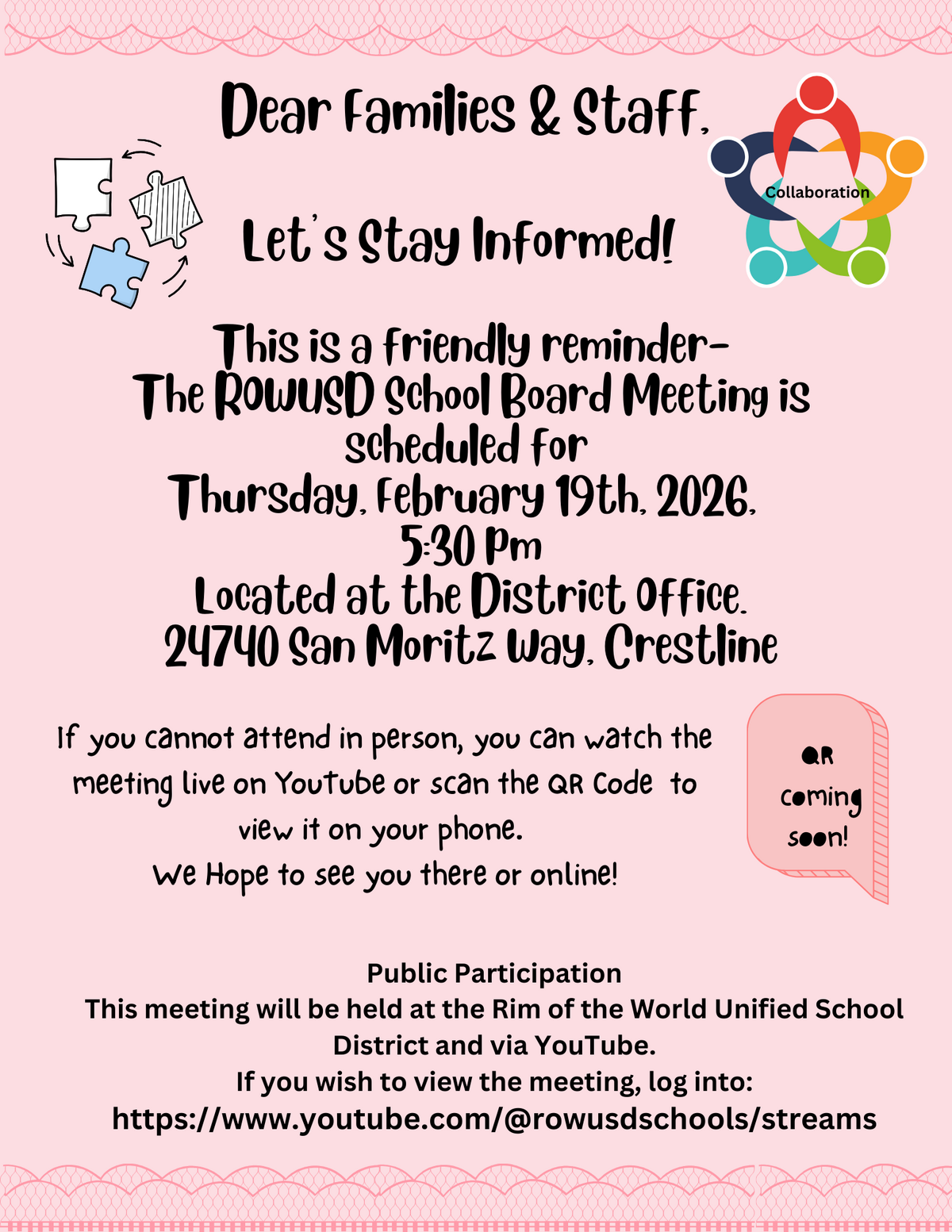 Page: Dear Families & Staff, Let’s Stay Informed! This is a friendly reminder- The ROWUSD School Board Meeting is scheduled for Thursday, February 19th, 2026.