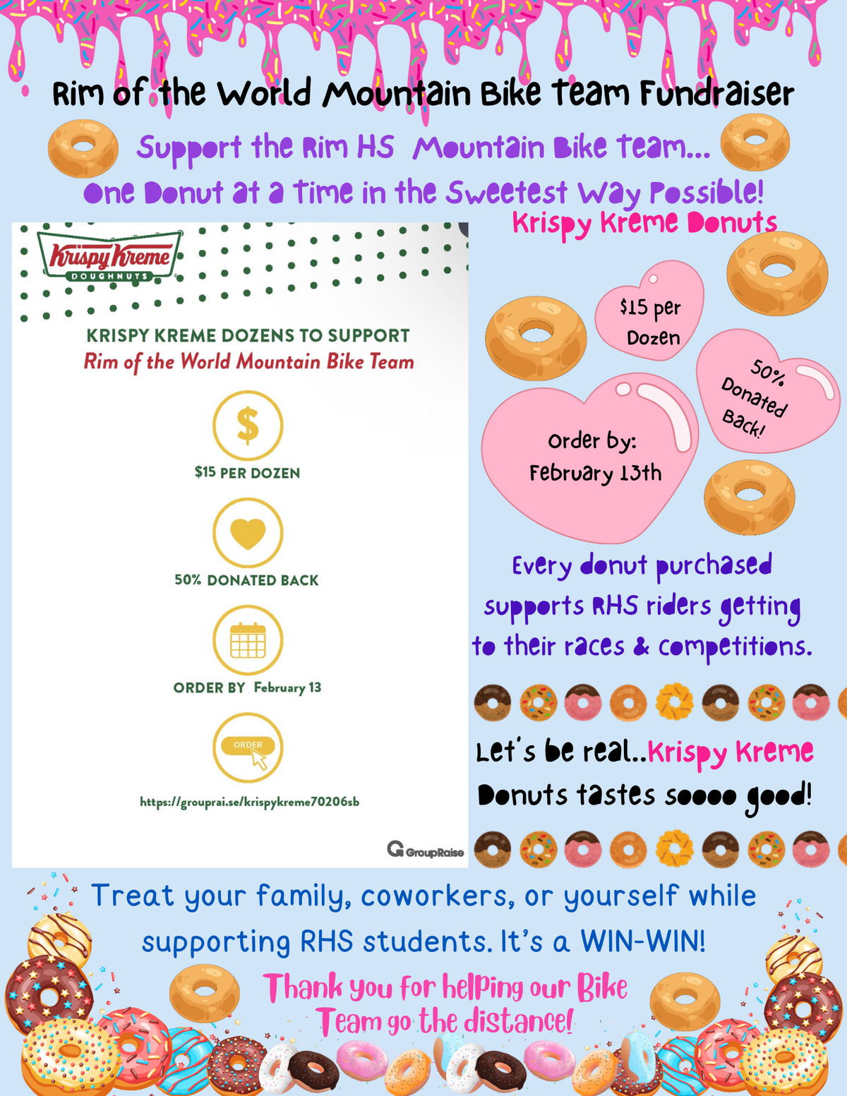 Page: Rim of the World Mountain Bike Team Fundraiser. Support the Rim HS  Mountain Bike Team... One Donut at a Time in the Sweetest Way Possible! Krispy Kreme Donuts.  Every donut purchased supports RHS riders getting to their races & competitions. $15 per order,  Order by February 13th, 50% Donated Back! Every donut purchased supports RHS riders getting to their races & competitions. Let’s be real..Krispy Kreme Donuts tastes soooo good! Treat your family, coworkers, or yourself while supporting RHS students. It’s a WIN-WIN! Thank you for helping our Bike Team go the distance!
