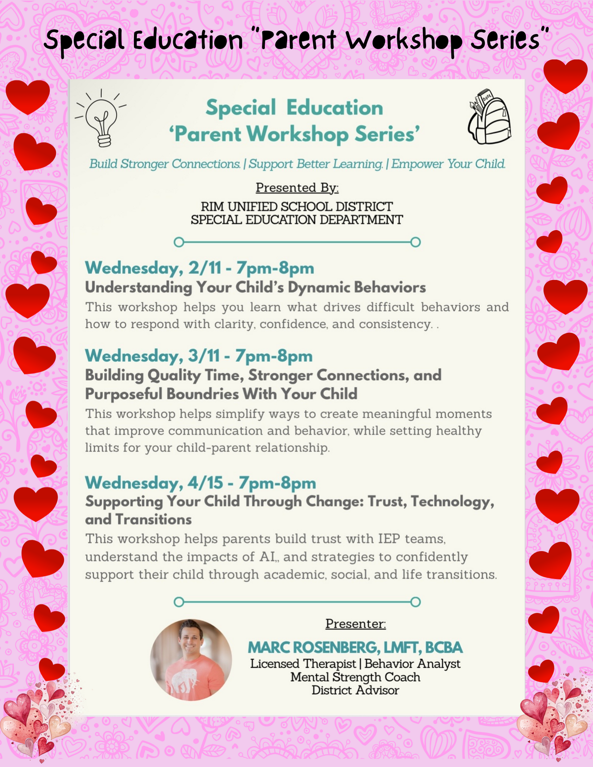 Wednesday, 4/15, 7 pm - 8 pm: Supporting Your Child Through Change: Trust, Technology, and Transitions: This workshop helps parents build trust with IEP teams, understand the impact of AI, and strategies to confidently support their child through academic, social, and life transitions. Presenter: Marc Rosenberg, LMFT, BCBA