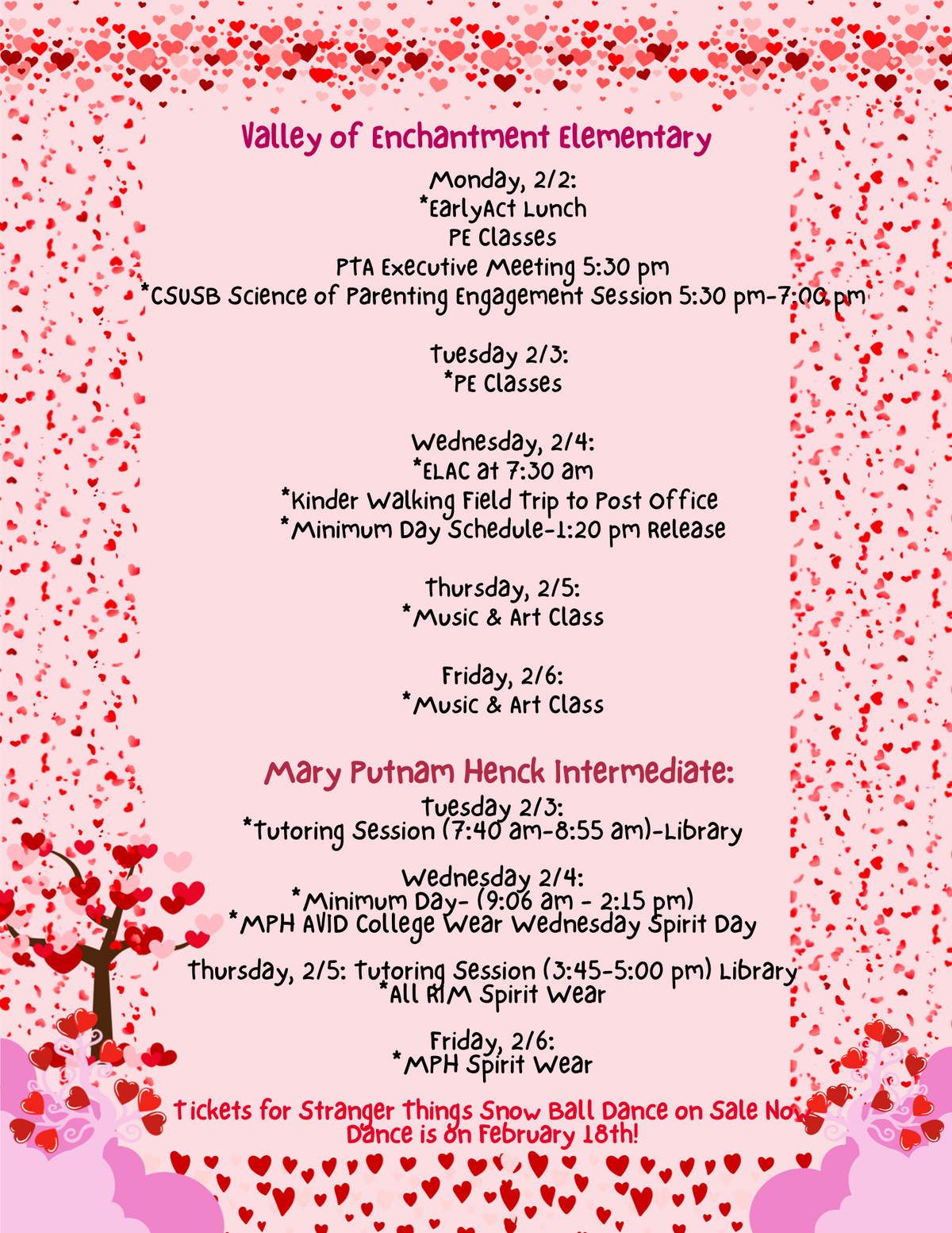 Page: Valley of Enchantment Elementary. Monday, 2/2: *EarlyAct Lunch PE Classes PTA Executive Meeting 5:30 pm *CSUSB Science of Parenting Engagement Session 5:30 pm-7:00 pm, Tuesday 2/3: , *PE Classes, Wednesday, 2/4:, *ELAC at 7:30 am, *Kinder Walking Field Trip to Post Office, *Minimum Day Schedule-1:20 pm Release