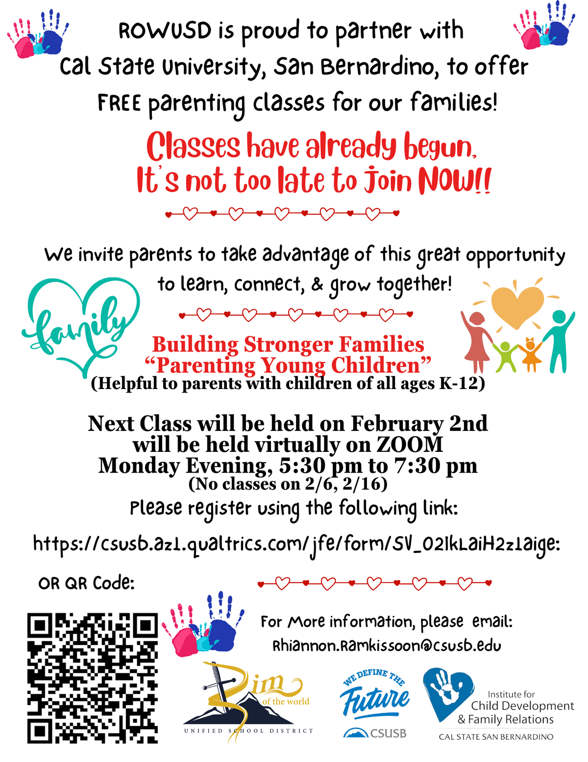 Page: ROWUSD is proud to partner with Cal State University, San Bernardino, to offer FREE parenting classes for our families! Classes have already begun,