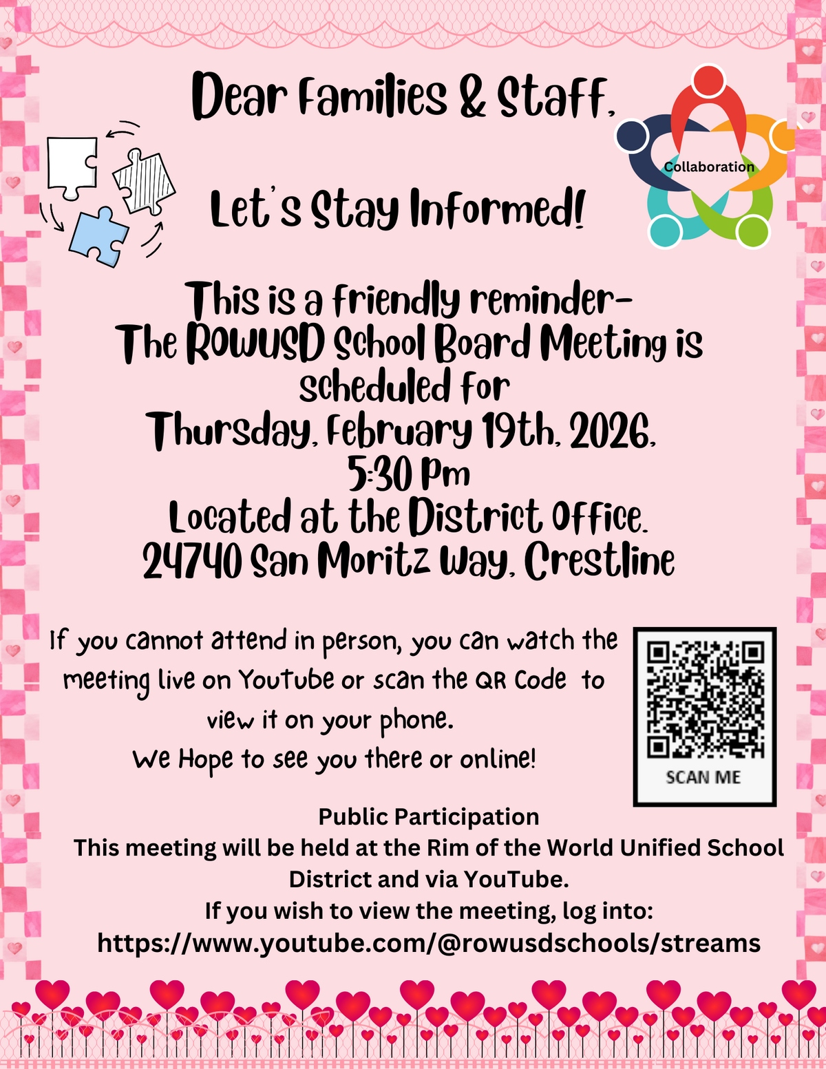 Page: Board Meeting:  Dear Families & Staff, Let’s Stay Informed! This is a friendly reminder- The ROWUSD School Board Meeting is scheduled for Thursday, February 19th, 2026.  at 5:30 pm. Located at the District Office. 24740 San Moritz Way, Crestline. If you cannot attend in person, you can watch the meeting live on YouTube or scan the QR Code to view it on your phone. We hope to see you there or online! Public Participation