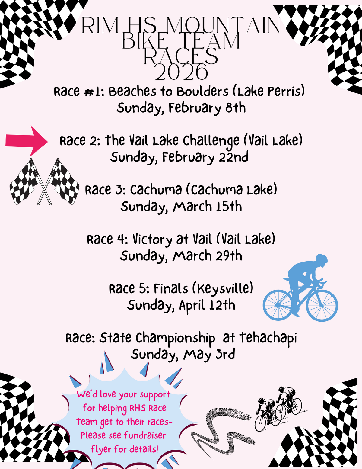 Page:  RIM HS MOUNTAIN BIKE TEAM RACES 2026: Race 2: The Vail Lake Challenge (Vail Lake), Sunday, February 22nd, Race 3: Cachuma (Cachuma Lake) Sunday, March 15th, Race 4: Victory at Vail (Vail Lake), Sunday, March 29th, Race 5: Finals (Keysville), Sunday, April 12th, Race: State Championship at Tehachapi Sunday, May 3rd. We’d love your support for helping the RHS Race Team get to their races- Please see the fundraiser flyer for details!