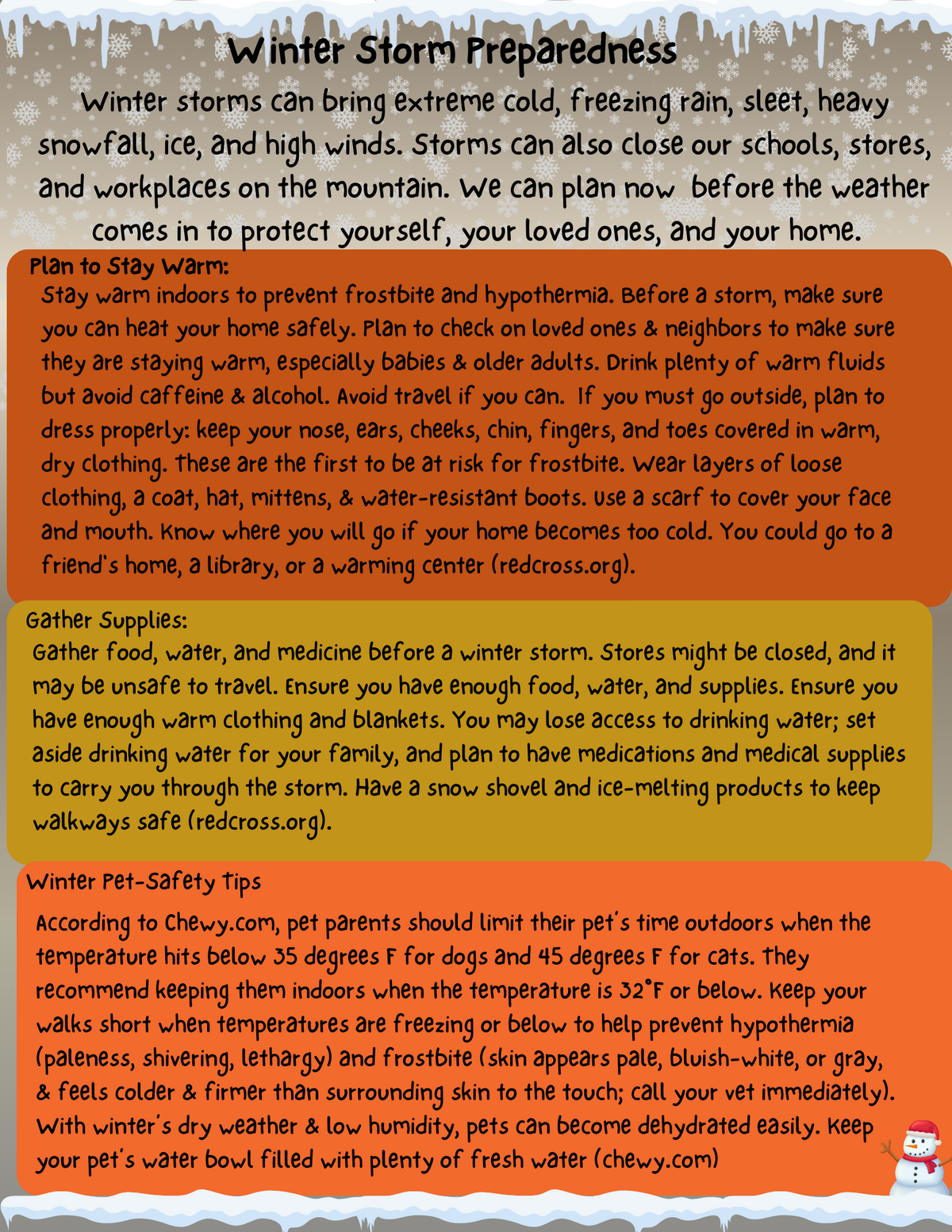 Page: Winter Storm Preparedness-Winter storms can bring extreme cold, freezing rain, sleet, heavy snowfall, ice, and high winds. Storms can also close our schools, stores, and workplaces on the mountain. We can plan now before the weather comes in to protect yourself, your loved ones, and your home. Plan to Stay Warm: Plan to Stay Warm: Stay warm indoors to prevent frostbite and hypothermia. Before a storm, make sure you can heat your home safely. Plan to check on loved ones & neighbors to make sure they are staying warm, especially babies & older adults. Drink plenty of warm fluids but avoid caffeine & alcohol. Avoid travel if you can.  If you must go outside, plan to dress properly: keep your nose, ears, cheeks, chin, fingers, and toes covered in warm, dry clothing. These are the first to be at risk for frostbite. Wear layers of loose clothing, a coat, hat, mittens, & water-resistant boots. Use a scarf to cover your face and mouth. Know where you will go if your home becomes too cold. You could go to a friend's home, a library, or a warming center (redcross.org). Gather Supplies: Gather food, water, and medicine before a winter storm. Stores might be closed, and it may be unsafe to travel. Ensure you have enough food, water, and supplies. Ensure you have enough warm clothing and blankets. You may lose access to drinking water; set aside drinking water for your family, and plan to have medications and medical supplies to carry you through the storm. Have a snow shovel and ice-melting products to keep walkways safe (redcross.org). Winter Pet-Safety Tips-According to Chewy.com, pet parents should limit their pet’s time outdoors when the temperature hits below 35 degrees F for dogs and 45 degrees F for cats. They recommend keeping them indoors when the temperature is 32°F or below. Keep your walks short when temperatures are freezing or below to help prevent hypothermia (paleness, shivering, lethargy) and frostbite (skin appears pale, bluish-white, or gray, & feels colder & firmer than surrounding skin to the touch; call your vet immediately).