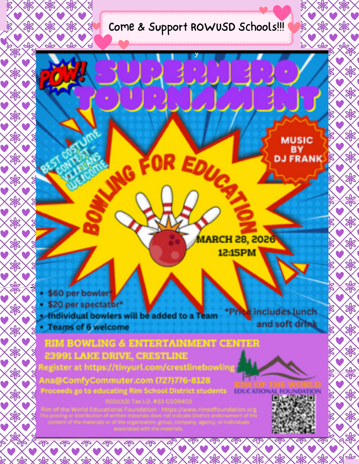 Page: Come & Support ROWUSD Schools!!! SuperHero Tournament. Best Costumes..Villains Welcome. Bowlig for Education. March 28th, 2026. Music by DJ Frank. $60 per bowler, $20 per spectator.. Individual bowlers will be added to a team. Teams of 6 welcome. Price includes lunch and a drink. Rim Bowling & Entertainment Center. 23991 Lake Drive, Crestline, CA 92325. Register at: https://tinyurl.com/crestlinebowling Ana@ComfyCommuter.com or call (727) 776-8128. Proceeds go to educating Rim School District Students. 501(c)(3) Tax ID# 33-0109403 Rim of the World Educational Foundation\https:////////www.rimedfoundation.org