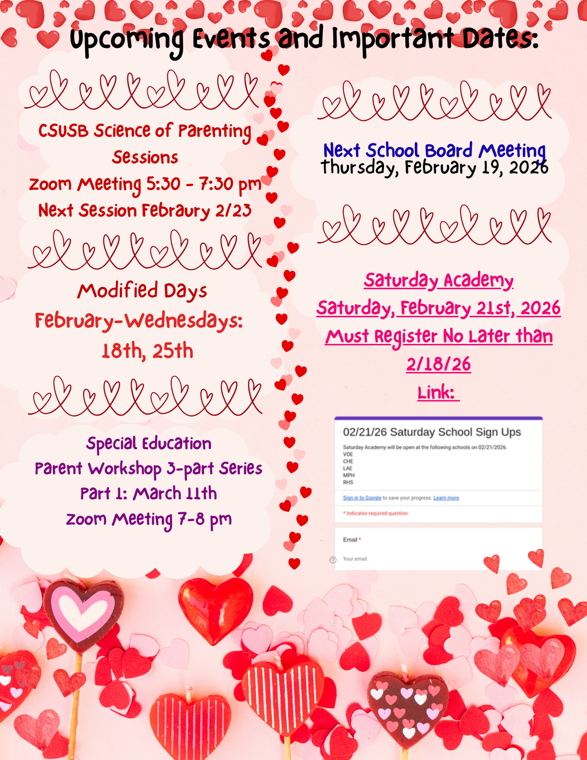Page: Upcoming Events and Important Dates: CSUSB Science of Parenting Sessions Zoom Meeting 5:30 - 7:30 pm Next Session February 2/23. Modified Days February-Wednesdays:  18th, 25th. Special Education Parent Workshop 3-part Series Part 1: March 11th