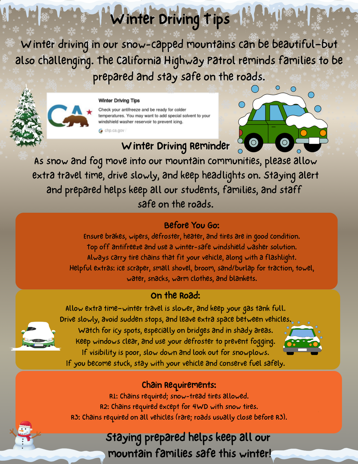 As snow and fog move into our mountain communities, please allow extra travel time, drive slowly, and keep headlights on. Staying alert and prepared helps keep all our students, families, and staff safe on the roads. Before You Go: Ensure brakes, wipers, defroster, heater, and tires are in good condition. Top off antifreeze and use a winter-safe windshield washer solution. Always carry tire chains that fit your vehicle, along with a flashlight. Helpful extras: ice scraper, small shovel, broom, sand/burlap for traction, towel, water, snacks, warm clothes, and blankets. On the Road: Allow extra time—winter travel is slower, and keep your gas tank full. Drive slowly, avoid sudden stops, and leave extra space between vehicles. Watch for icy spots, especially on bridges and in shady areas. Keep windows clear, and use your defroster to prevent fogging. If visibility is poor, slow down and look out for snowplows. If you become stuck, stay with your vehicle and conserve fuel safely. Chain Requirements:
