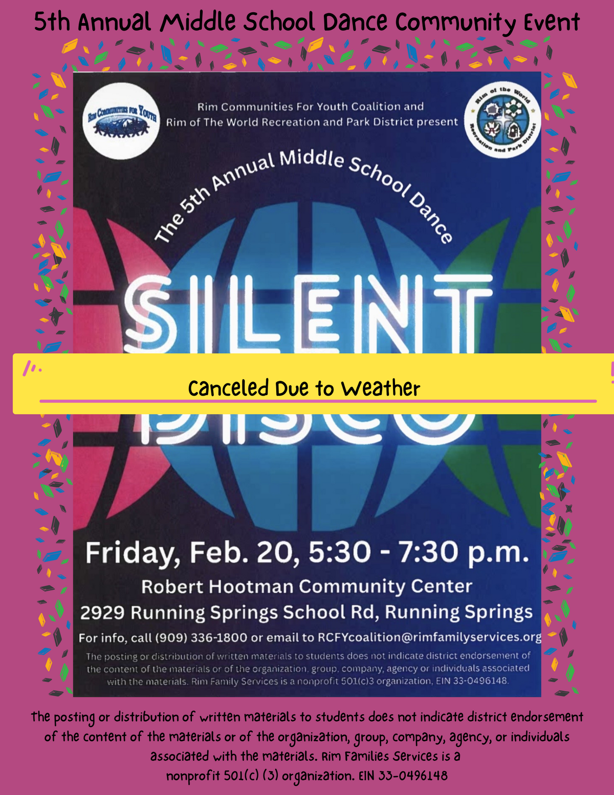 Page: Rim Communities for Youth Coalition and Rim of the World Recreation and Park District present the 5th Annual Middle School Dance. "Silent Disco" Friday, Feb. 20th, 2026, from 5:30 pm to 7:30 pm. at the Robert Hootman Community Center. 2929 Running Springs School Rd.  For more information call 909-336-1800 or email to RCYF coalition@rimfamilyservices.org