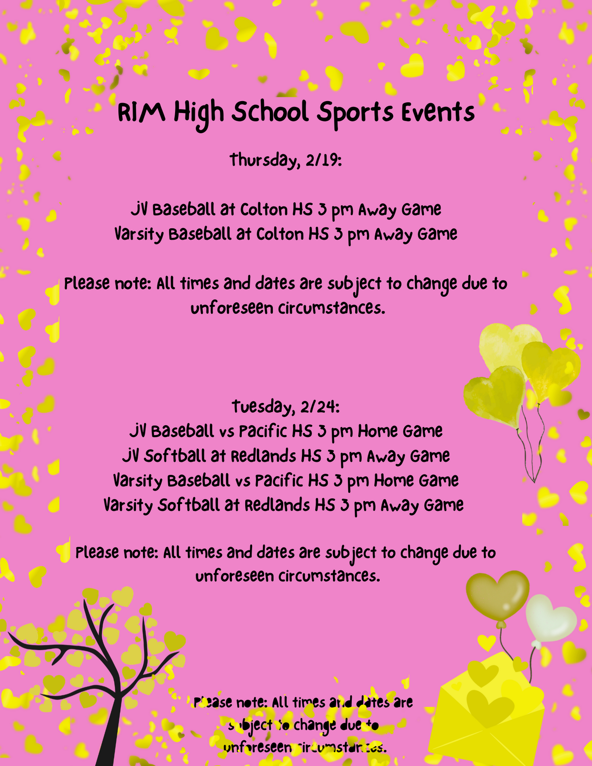 Varsity Baseball at Colton HS 3 pm Away Game, Tuesday, 2/24: JV Baseball vs Pacific HS 3 pm Home Game, JV Softball at Redlands HS 3 pm Away Game, Varsity Baseball vs Pacific HS 3 pm Home Game, Varsity Softball at Redlands HS 3 pm Away Game. Please note: All times and dates are subject to change due to unforeseen circumstances.